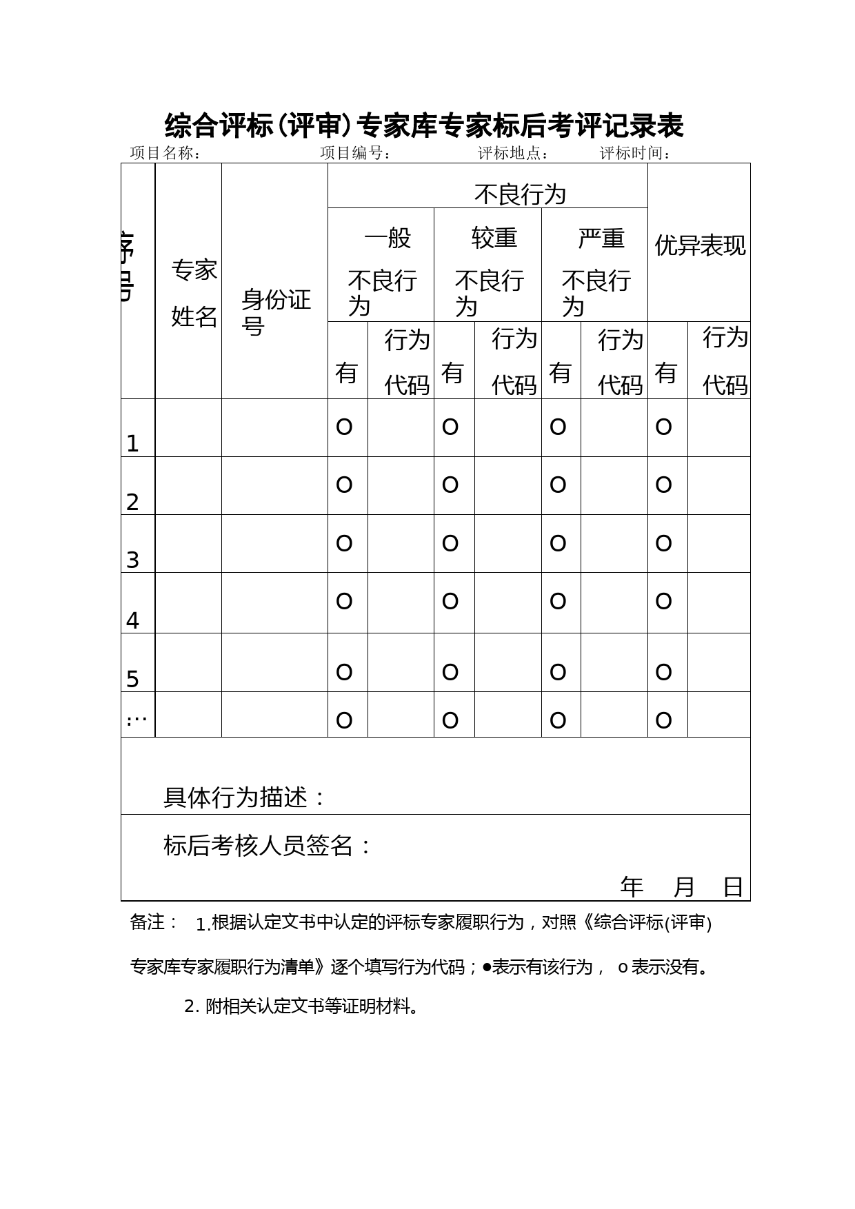 綜合評(píng)標(biāo)(評(píng)審)專家?guī)鞂<覙?biāo)后考評(píng)記錄表項(xiàng)目名稱:項(xiàng)目編號(hào):評(píng)標(biāo)地點(diǎn):評(píng)標(biāo)時(shí)間:不良行為序一般較重嚴(yán)重優(yōu)異表現(xiàn)號(hào)專家不良行不良行不良行身份證姓名號(hào)為為為行為行為行為行為有代碼有代碼有代碼有代碼1OOOO2OOOO3OOOO4OOOO5OOOO…·OOOO具體行為描述:標(biāo)后考核人員簽名:年月日備注:1.根據(jù)認(rèn)定文書(shū)中認(rèn)定的評(píng)標(biāo)專家履職行為,對(duì)照《綜合評(píng)標(biāo)(評(píng)審)專家?guī)鞂<衣穆毿袨榍鍐巍分饌€(gè)填寫(xiě)行為代碼;●表示有該行為,o表示沒(méi)有。2.附相關(guān)認(rèn)定文書(shū)等證明材料。