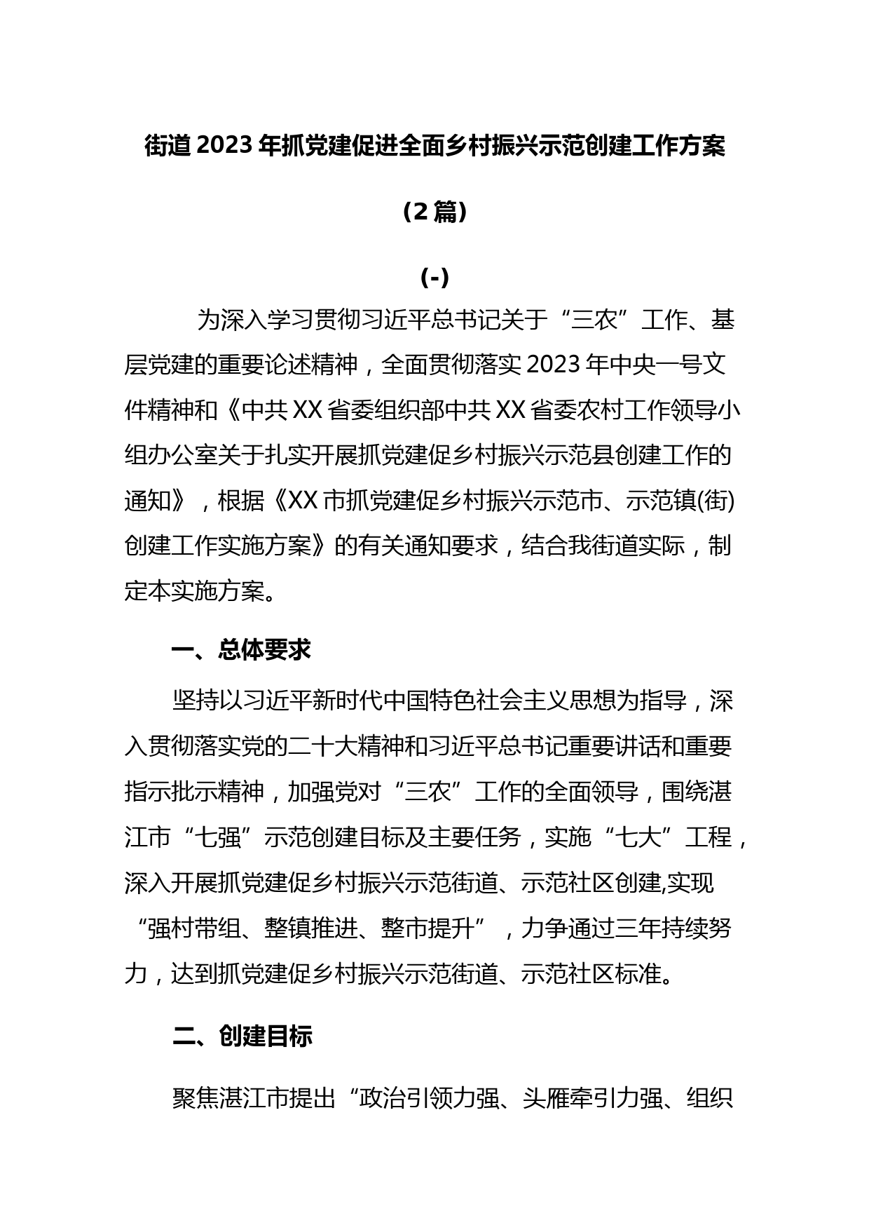 街道2023年抓黨建促進全面鄉(xiāng)村振興示范創(chuàng)建工作方案(2篇)(-)為深入學習貫徹習近平總書記關(guān)于“三農(nóng)”工作、基層黨建的重要論述精神,全面貫徹落實2023年中央一號文件精神和《中共XX省委組織部中共XX省委農(nóng)村工作領(lǐng)導(dǎo)小組辦公室關(guān)于扎實開展抓黨建促鄉(xiāng)村振興示范縣創(chuàng)建工作的通知》,根據(jù)《XX市抓黨建促鄉(xiāng)村振興示范市、示范鎮(zhèn)(街)創(chuàng)建工作實施方案》的有關(guān)通知要求,結(jié)合我街道實際,制定本實施方案。一、總體要求堅持以習近平新時代中國特色社會主義思想為指導(dǎo),深入貫徹落實黨的二十大精神和習近平總書記重要講話和重要指示批示精神,加強黨對“三農(nóng)”工作的全面領(lǐng)導(dǎo),...