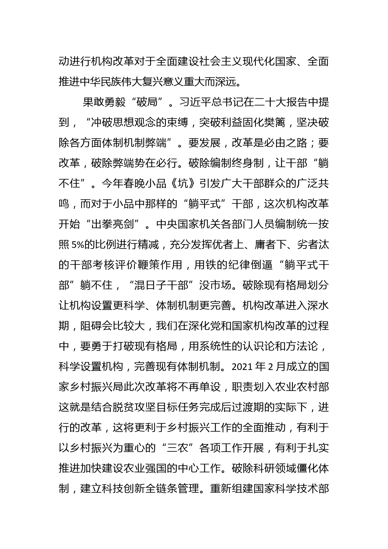 黨和國家機構(gòu)改革心得體會匯編(6篇)目錄躬身入“局”澎湃機構(gòu)“改革”動能機構(gòu)改革,變動中蘊含新機遇落實機構(gòu)改革任務(wù),轉(zhuǎn)變政府職能充分認識黨和國家機構(gòu)改革的重要性和緊迫性不折不扣把機構(gòu)改革任務(wù)落到實處“破”“立”之間釋放機構(gòu)改革新動能2023年2月26日至28日召開的中國共產(chǎn)黨第二十屆中央委員會第二次全體會議,審議通過了在廣泛征求意見的基礎(chǔ)上提出的《黨和國家機構(gòu)改革方案》,3月7日國務(wù)院在第十四屆全國人民代表大會第一次會議上做《關(guān)于國務(wù)院機構(gòu)改革方案的說明》。在全面貫徹黨的二十大精神的開局之年、實施“十四五”規(guī)劃承前啟后的關(guān)鍵之年,推動進...