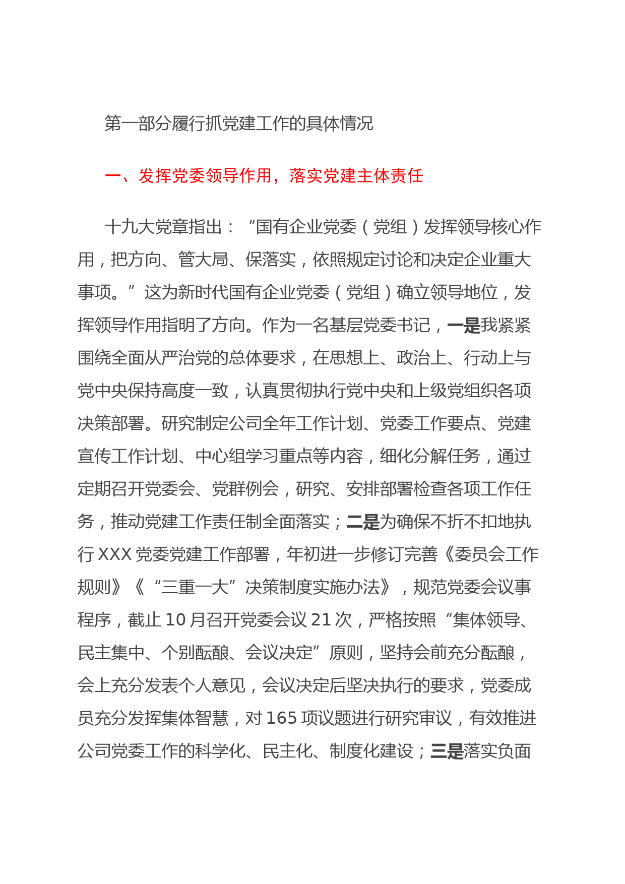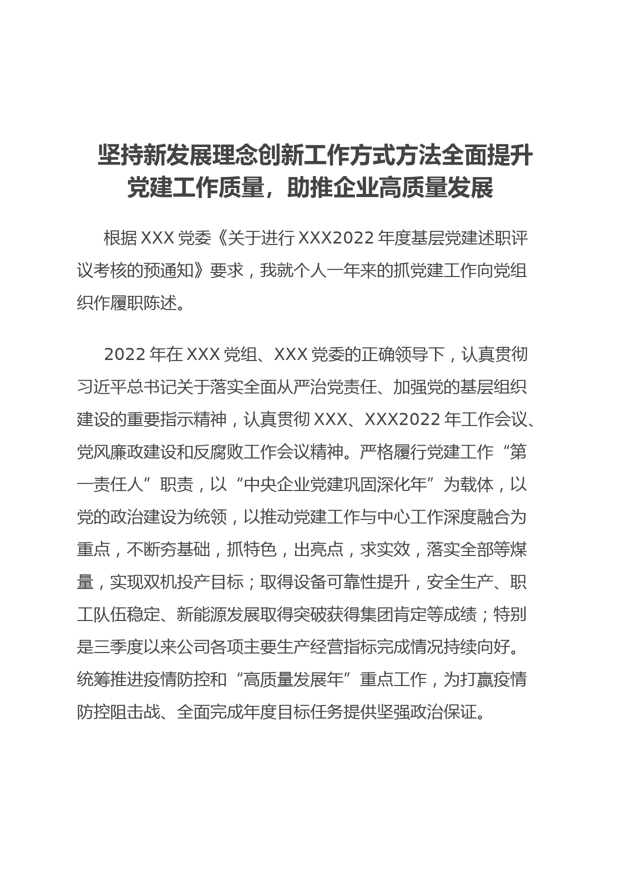 堅(jiān)持新發(fā)展理念創(chuàng)新工作方式方法全面提升黨建工作質(zhì)量,助推企業(yè)高質(zhì)量發(fā)展根據(jù)XXX黨委《關(guān)于進(jìn)行XXX2022年度基層黨建述職評議考核的預(yù)通知》要求,我就個(gè)人一年來的抓黨建工作向黨組織作履職陳述。2022年在XXX黨組、XXX黨委的正確領(lǐng)導(dǎo)下,認(rèn)真貫徹習(xí)近平總書記關(guān)于落實(shí)全面從嚴(yán)治黨責(zé)任、加強(qiáng)黨的基層組織建設(shè)的重要指示精神,認(rèn)真貫徹XXX、XXX2022年工作會議、黨風(fēng)廉政建設(shè)和反腐敗工作會議精神。嚴(yán)格履行黨建工作“第一責(zé)任人”職責(zé),以“中央企業(yè)黨建鞏固深化年”為載體,以黨的政治建設(shè)為統(tǒng)領(lǐng),以推動黨建工作與中心工作深度融合為重點(diǎn),不斷夯基礎(chǔ),抓特色,出亮點(diǎn)...
