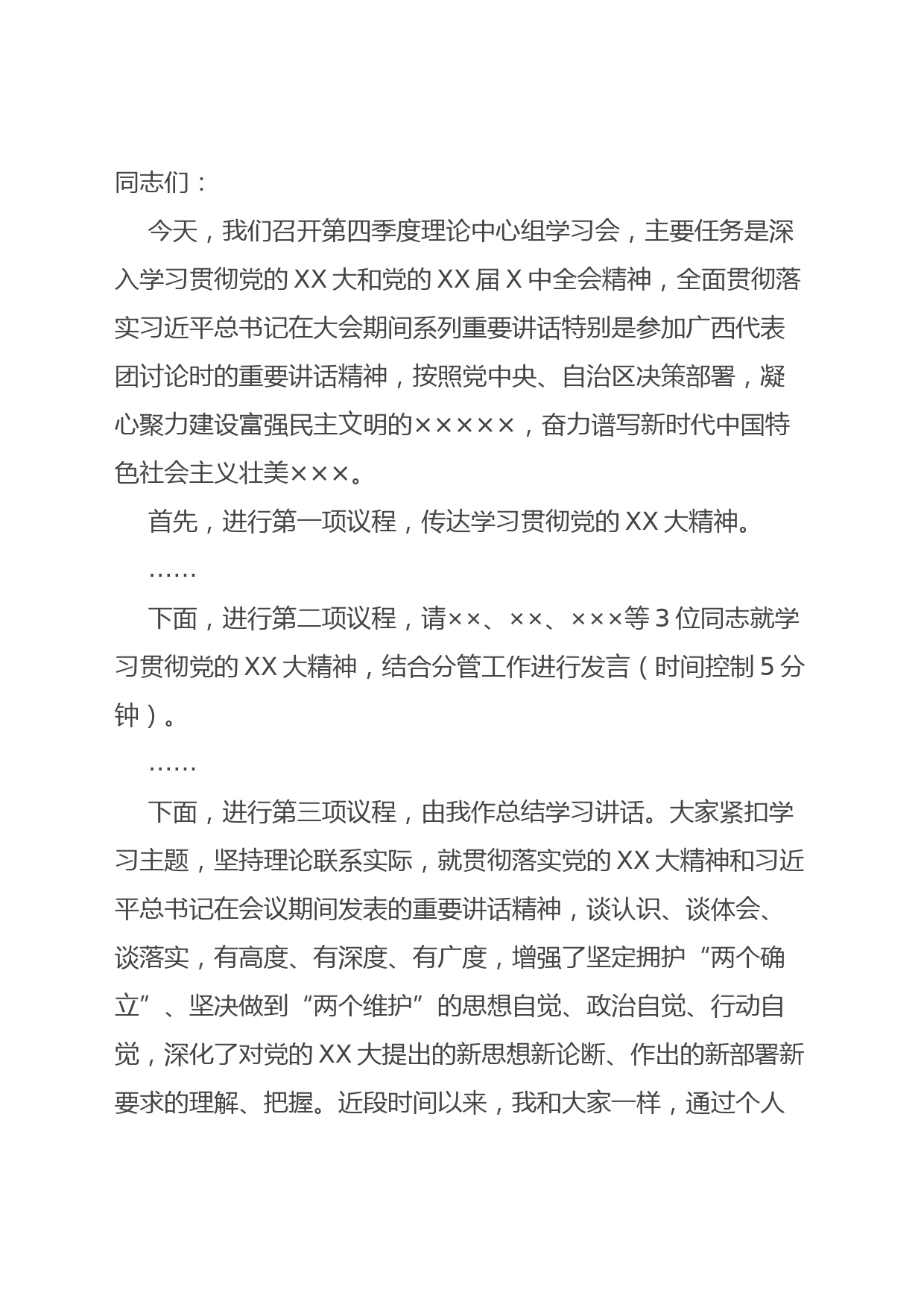 同志們:今天,我們召開第四季度理論中心組學(xué)習(xí)會,主要任務(wù)是深入學(xué)習(xí)貫徹黨的XX大和黨的XX屆X中全會精神,全面貫徹落實習(xí)近平總書記在大會期間系列重要講話特別是參加廣西代表團討論時的重要講話精神,按照黨中央、自治區(qū)決策部署,凝心聚力建設(shè)富強民主文明的×××××,奮力譜寫新時代中國特色社會主義壯美×××。首先,進行第一項議程,傳達學(xué)習(xí)貫徹黨的XX大精神?!旅?,進行第二項議程,請××、××、×××等3位同志就學(xué)習(xí)貫徹黨的XX大精神,結(jié)合分管工作進行發(fā)言(時間控制5分鐘)?!旅?,進行第三項議程,由我作總結(jié)學(xué)習(xí)講話。大家緊扣學(xué)習(xí)主題,堅...