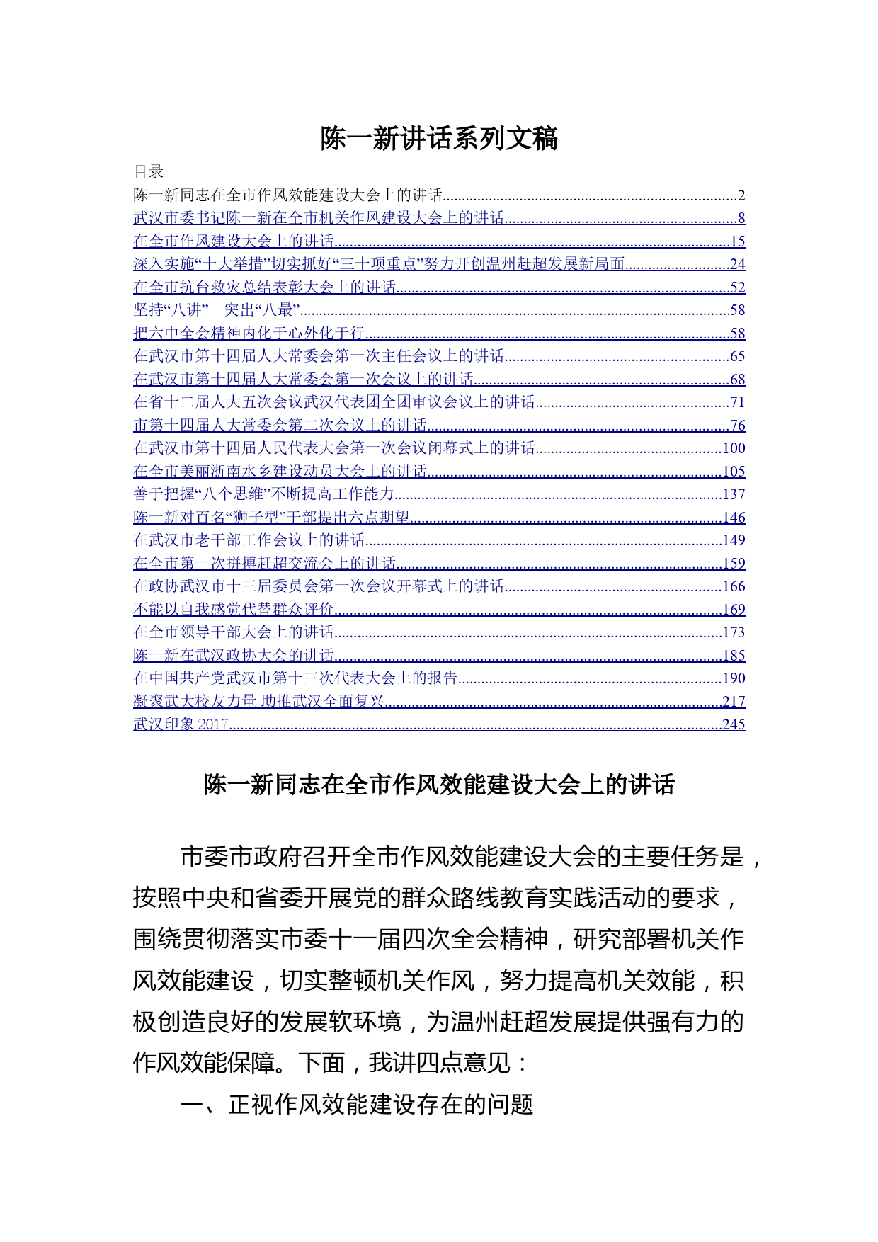 陳一新講話(huà)系列文稿目錄陳一新同志在全市作風(fēng)效能建設(shè)大會(huì)上的講話(huà)............................................................................2武漢市委書(shū)記陳一新在全市機(jī)關(guān)作風(fēng)建設(shè)大會(huì)上的講話(huà)............................................................8在全市作風(fēng)建設(shè)大會(huì)上的講話(huà).......................................................................................................15深入實(shí)施“十大舉措”切實(shí)抓好“三十項(xiàng)重點(diǎn)”努力開(kāi)創(chuàng)溫州趕超發(fā)展新局面...........................24在全市抗臺(tái)救災(zāi)總結(jié)表彰大會(huì)上的講話(huà).......................