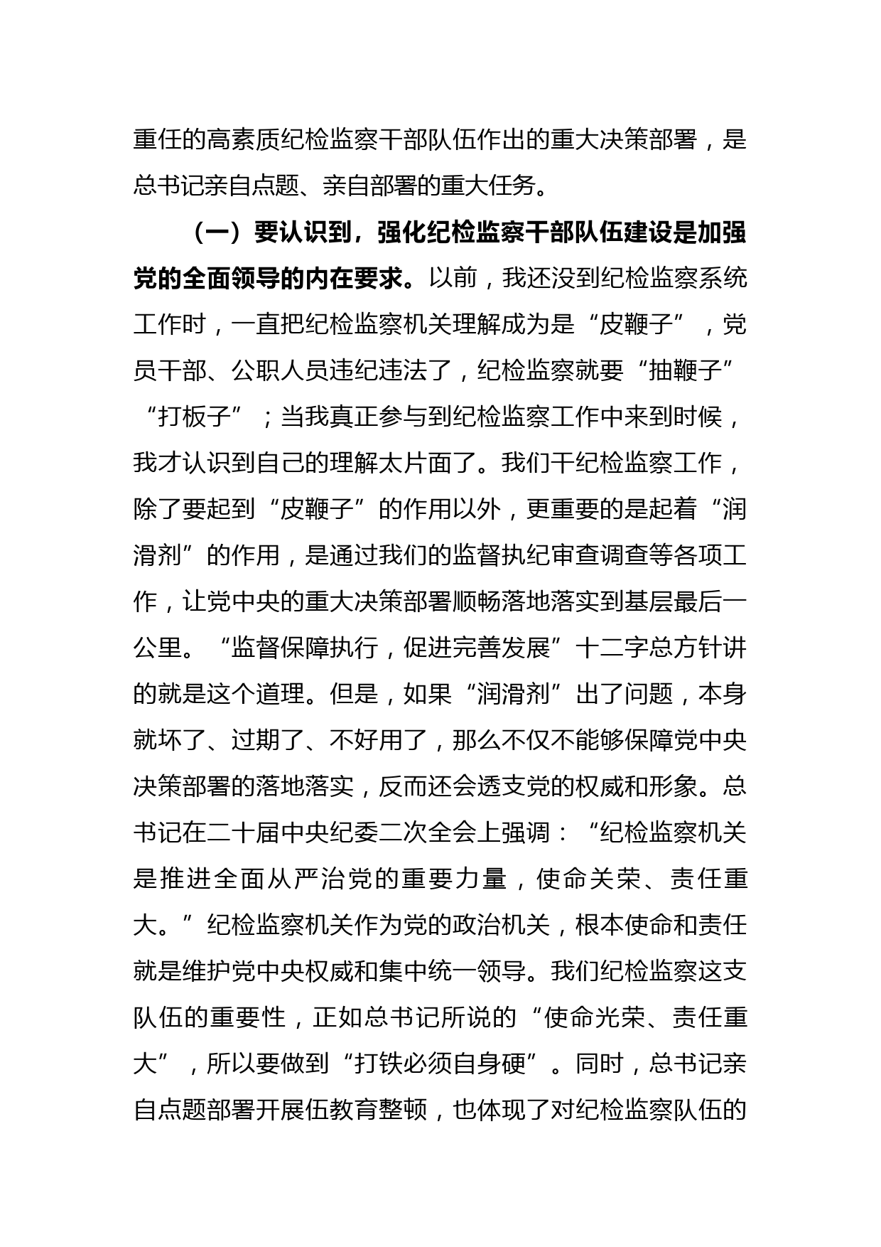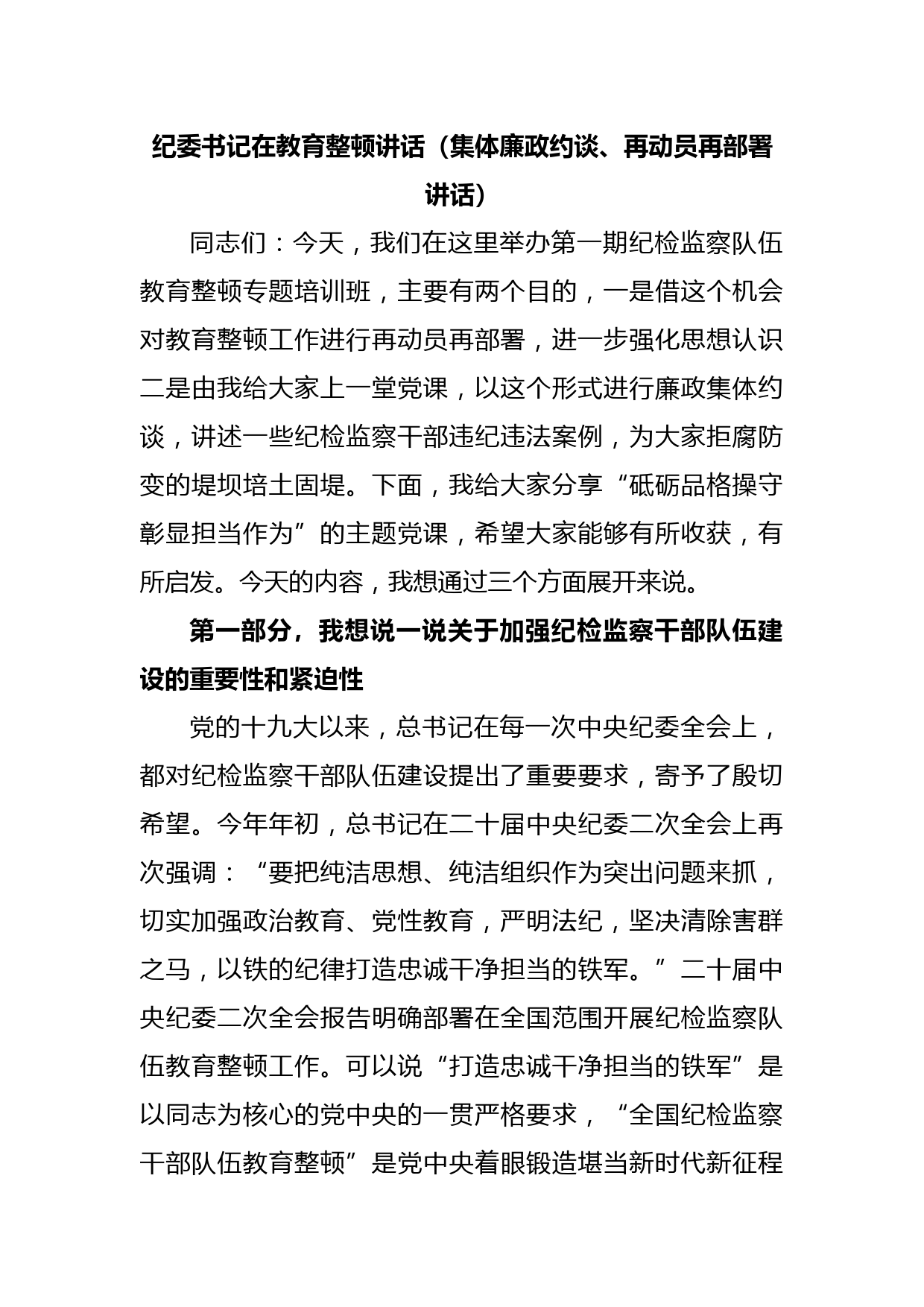 紀委書記在教育整頓講話(集體廉政約談、再動員再部署講話)同志們:今天,我們在這里舉辦第一期紀檢監(jiān)察隊伍教育整頓專題培訓班,主要有兩個目的,一是借這個機會對教育整頓工作進行再動員再部署,進一步強化思想認識二是由我給大家上一堂黨課,以這個形式進行廉政集體約談,講述一些紀檢監(jiān)察干部違紀違法案例,為大家拒腐防變的堤壩培土固堤。下面,我給大家分享“砥礪品格操守彰顯擔當作為”的主題黨課,希望大家能夠有所收獲,有所啟發(fā)。今天的內(nèi)容,我想通過三個方面展開來說。第一部分,我想說一說關于加強紀檢監(jiān)察干部隊伍建設的重要性和緊迫性黨的十九大以來,總...