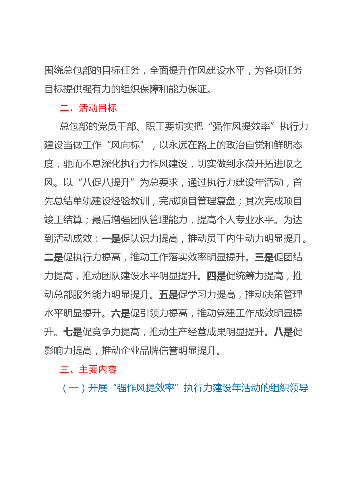 “強作風(fēng)提效率”執(zhí)行力建設(shè)年活動實施細(xì)則在全面落實黨的XX大精神、學(xué)習(xí)宣傳貫徹集團公司第一次黨代會精神的重要時刻,也是在總包部全力推進軌道交通收尾工作的關(guān)鍵一年,×××集團公司決定開展“強作風(fēng)提效率”執(zhí)行力建設(shè)年活動,這是全面增強總包部發(fā)展驅(qū)動力,進一步提振干事創(chuàng)業(yè)精氣神,以奮發(fā)有為的精神狀態(tài)、高質(zhì)高效的工作水平、務(wù)實進取的工作作風(fēng),堅定執(zhí)著推動高質(zhì)量發(fā)展、創(chuàng)造高品質(zhì)工程質(zhì)量的重要活動。根據(jù)《關(guān)于印發(fā)〈××ד強作風(fēng)提效率”執(zhí)行力建設(shè)年活動實施方案〉的通知》精神和要求,經(jīng)總包部研究,決定從即日起在總包部開展“強作風(fēng)提效率”執(zhí)行...