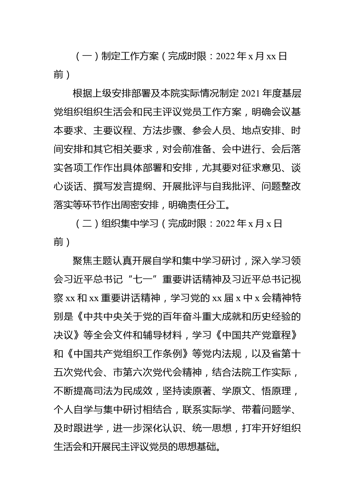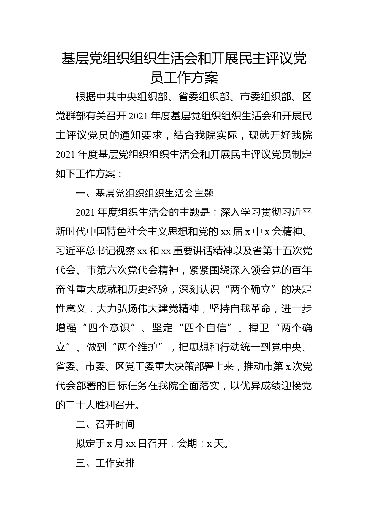基層黨組織組織生活會(huì)和開展民主評(píng)議黨員工作方案根據(jù)中共中央組織部、省委組織部、市委組織部、區(qū)黨群部有關(guān)召開2021年度基層黨組織組織生活會(huì)和開展民主評(píng)議黨員的通知要求,結(jié)合我院實(shí)際,現(xiàn)就開好我院2021年度基層黨組織組織生活會(huì)和開展民主評(píng)議黨員制定如下工作方案:一、基層黨組織組織生活會(huì)主題2021年度組織生活會(huì)的主題是:深入學(xué)習(xí)貫徹習(xí)近平新時(shí)代中國特色社會(huì)主義思想和黨的xx屆x中x會(huì)精神、習(xí)近平總書記視察xx和xx重要講話精神以及省第十五次黨代會(huì)、市第六次黨代會(huì)精神,緊緊圍繞深入領(lǐng)會(huì)黨的百年奮斗重大成就和歷史經(jīng)驗(yàn),深刻認(rèn)識(shí)“兩個(gè)確立”的決定性意...
