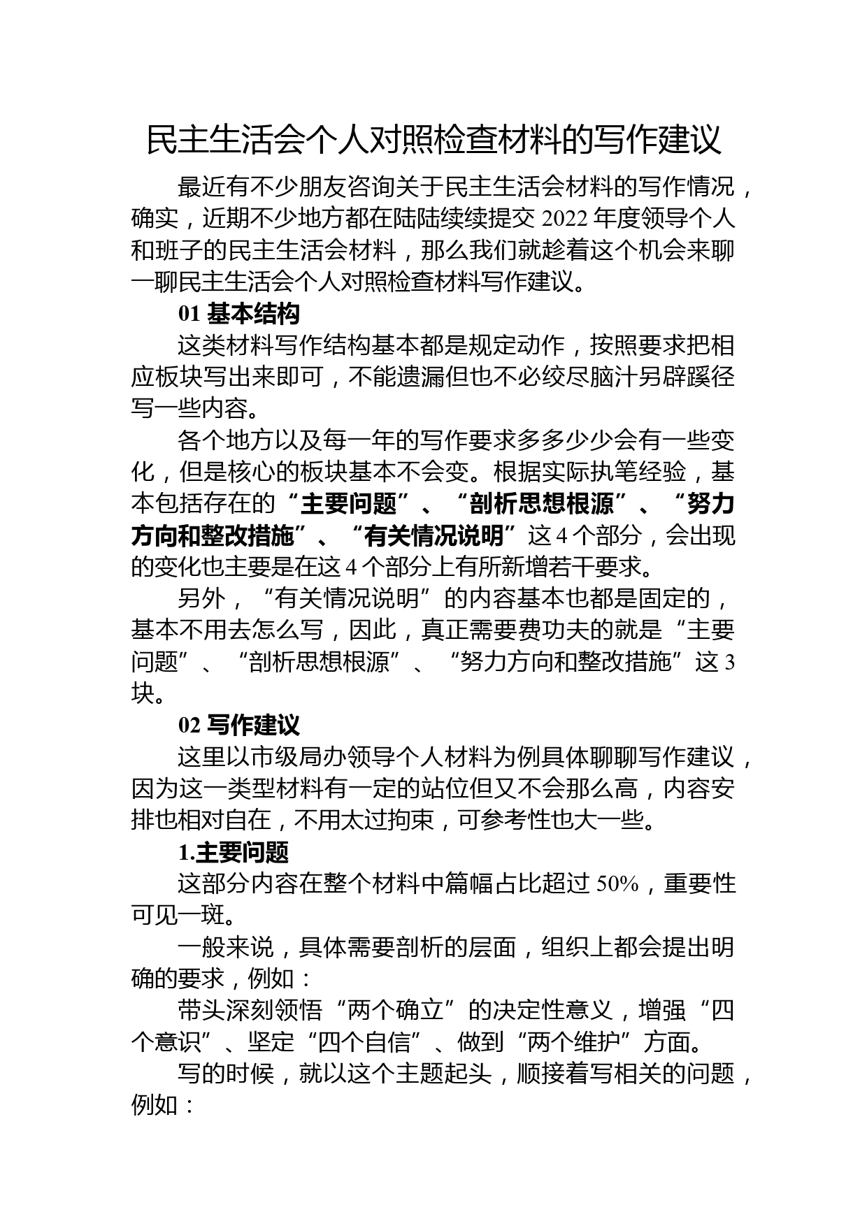 民主生活會(huì)個(gè)人對(duì)照檢查材料的寫作建議最近有不少朋友咨詢關(guān)于民主生活會(huì)材料的寫作情況,確實(shí),近期不少地方都在陸陸續(xù)續(xù)提交2022年度領(lǐng)導(dǎo)個(gè)人和班子的民主生活會(huì)材料,那么我們就趁著這個(gè)機(jī)會(huì)來聊一聊民主生活會(huì)個(gè)人對(duì)照檢查材料寫作建議。01基本結(jié)構(gòu)這類材料寫作結(jié)構(gòu)基本都是規(guī)定動(dòng)作,按照要求把相應(yīng)板塊寫出來即可,不能遺漏但也不必絞盡腦汁另辟蹊徑寫一些內(nèi)容。各個(gè)地方以及每一年的寫作要求多多少少會(huì)有一些變化,但是核心的板塊基本不會(huì)變。根據(jù)實(shí)際執(zhí)筆經(jīng)驗(yàn),基本包括存在的“主要問題”、“剖析思想根源”、“努力方向和整改措施”、“有關(guān)情況說明”這4個(gè)部...