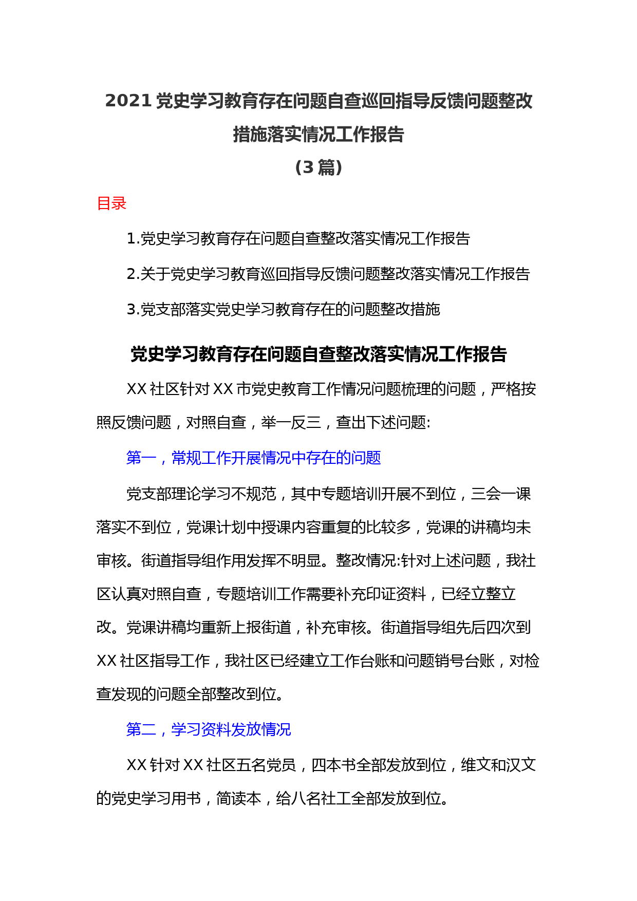 (3篇)2021黨史學(xué)習(xí)教育存在問題自查巡回指導(dǎo)反饋問題整改措施落實情況工作報告VIP免費
