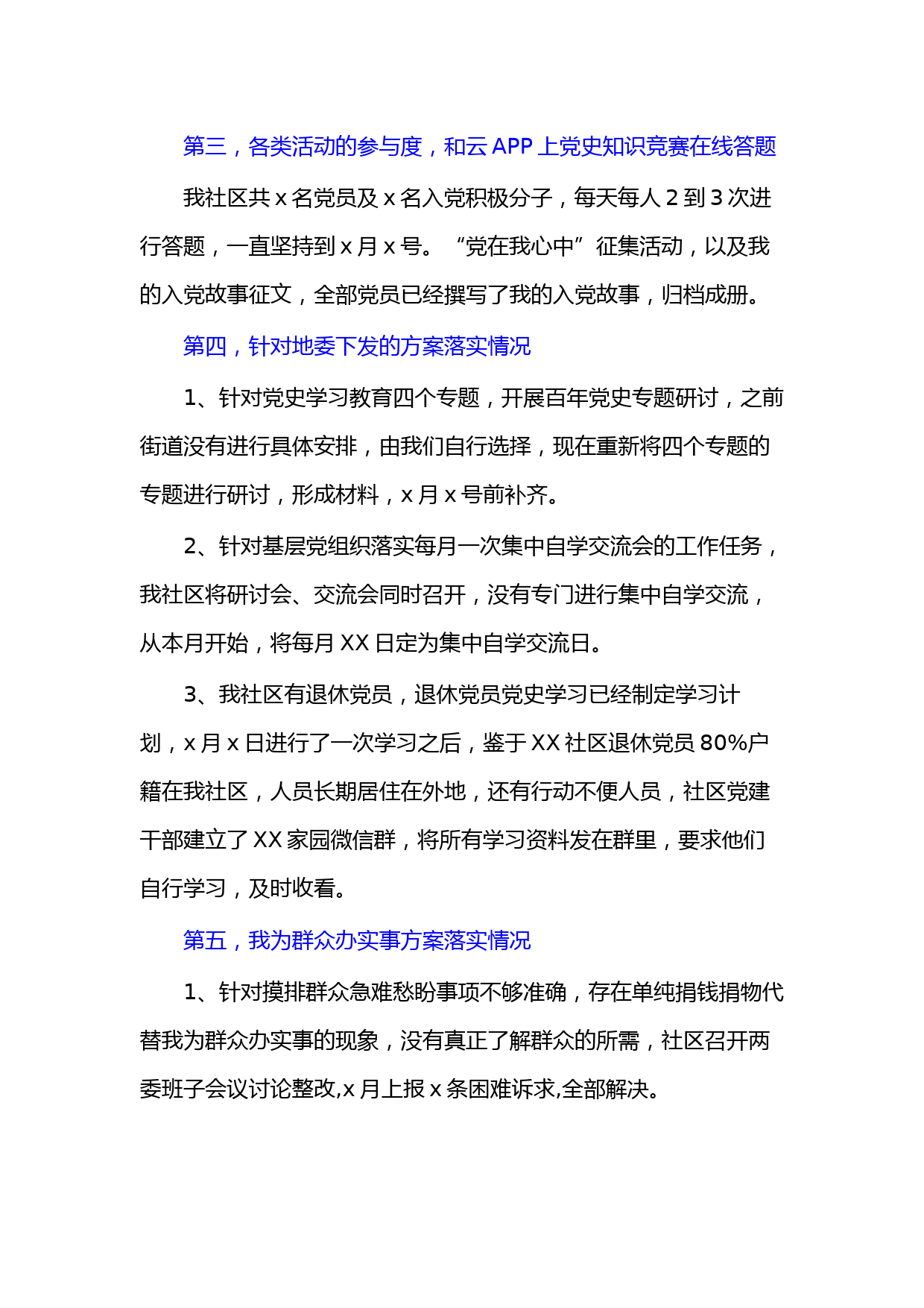 2021黨史學(xué)習(xí)教育存在問題自查巡回指導(dǎo)反饋問題整改措施落實情況工作報告(3篇)目錄1.黨史學(xué)習(xí)教育存在問題自查整改落實情況工作報告2.關(guān)于黨史學(xué)習(xí)教育巡回指導(dǎo)反饋問題整改落實情況工作報告3.黨支部落實黨史學(xué)習(xí)教育存在的問題整改措施黨史學(xué)習(xí)教育存在問題自查整改落實情況工作報告XX社區(qū)針對XX市黨史教育工作情況問題梳理的問題,嚴格按照反饋問題,對照自查,舉一反三,查出下述問題:第一,常規(guī)工作開展情況中存在的問題黨支部理論學(xué)習(xí)不規(guī)范,其中專題培訓(xùn)開展不到位,三會一課落實不到位,黨課計劃中授課內(nèi)容重復(fù)的比較多,黨課的講稿均未審核。街道指導(dǎo)組作用發(fā)揮...