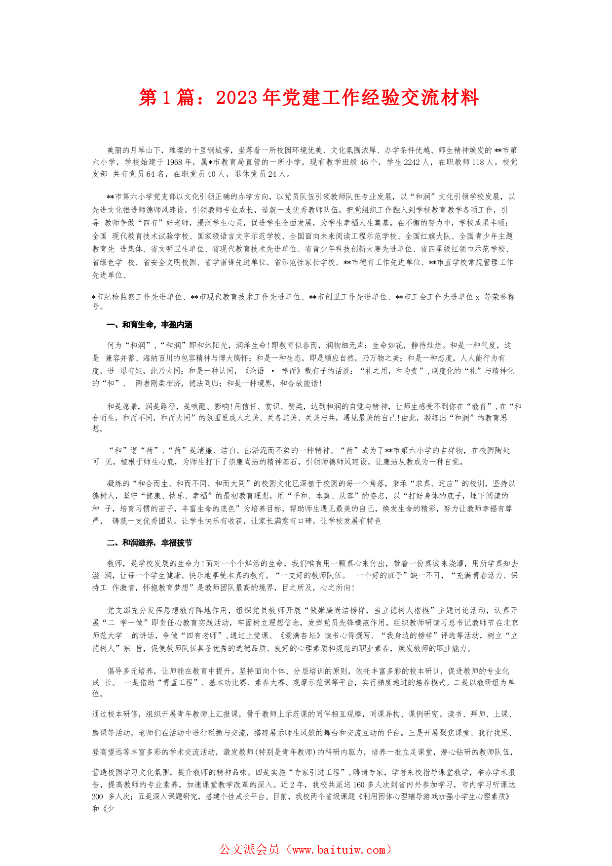 第1篇:2023年黨建工作經(jīng)驗(yàn)交流材料美麗的月琴山下,璀璨的十里鋼城旁,坐落著一所校園環(huán)境優(yōu)美、文化氛圍濃厚、辦學(xué)條件優(yōu)越、師生精神煥發(fā)的市第六小學(xué),學(xué)校始建于1968年,屬市教育局直管的一所小學(xué),現(xiàn)有教學(xué)班級(jí)46個(gè),學(xué)生2242人,在職教師118人。校覺支部共有黨員64名,在職黨員40人,退休黨員24人。市第六小學(xué)黨支部以文化引領(lǐng)正確的辦學(xué)方向,以黨員隊(duì)伍引領(lǐng)教師隊(duì)伍專業(yè)發(fā)展,以“和潤”文化引領(lǐng)學(xué)校發(fā)展,以先進(jìn)文化推進(jìn)師德師風(fēng)建設(shè),引領(lǐng)教師專業(yè)成長,造就一支優(yōu)秀教師隊(duì)伍,把黨組織工作融入到學(xué)校教育教學(xué)各項(xiàng)工作,引導(dǎo)教師爭做“四有”好老師,浸潤學(xué)生...