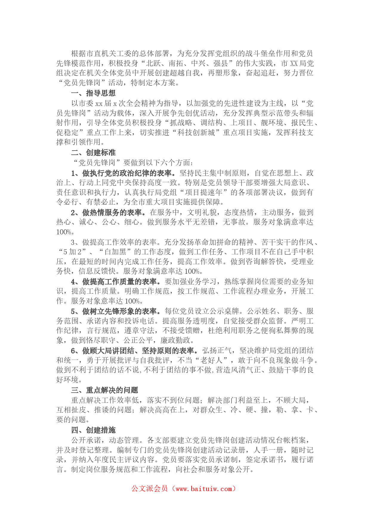 根據(jù)市直機(jī)關(guān)工委的總體部署,為充分發(fā)揮黨組織的戰(zhàn)斗堡壘作用和黨員先鋒模范作用,積極投身“北躍、南拓、中興、強(qiáng)縣”的偉大實(shí)踐,市XX局黨組決定在機(jī)關(guān)全體黨員中開展創(chuàng)建超越自我,再塑形象,奮起追趕,努力晉位“黨員先鋒崗”活動(dòng),特制定本方案。一、指導(dǎo)思想以市委xx屆x次全會(huì)精神為指導(dǎo),以加強(qiáng)黨的先進(jìn)性建設(shè)為主線,以“黨員先鋒崗”活動(dòng)為載體,深入開展?fàn)幭葎?chuàng)優(yōu)活動(dòng),充分發(fā)揮典型示范帶頭和輻射作用,引導(dǎo)全體黨員積極投身“抓戰(zhàn)略、調(diào)結(jié)構(gòu)、上項(xiàng)目、靚環(huán)境、報(bào)民生、促穩(wěn)定”重點(diǎn)工作上來,切實(shí)推進(jìn)“科技創(chuàng)新城”重點(diǎn)項(xiàng)目實(shí)施,發(fā)揮科技支撐和引領(lǐng)作用。...