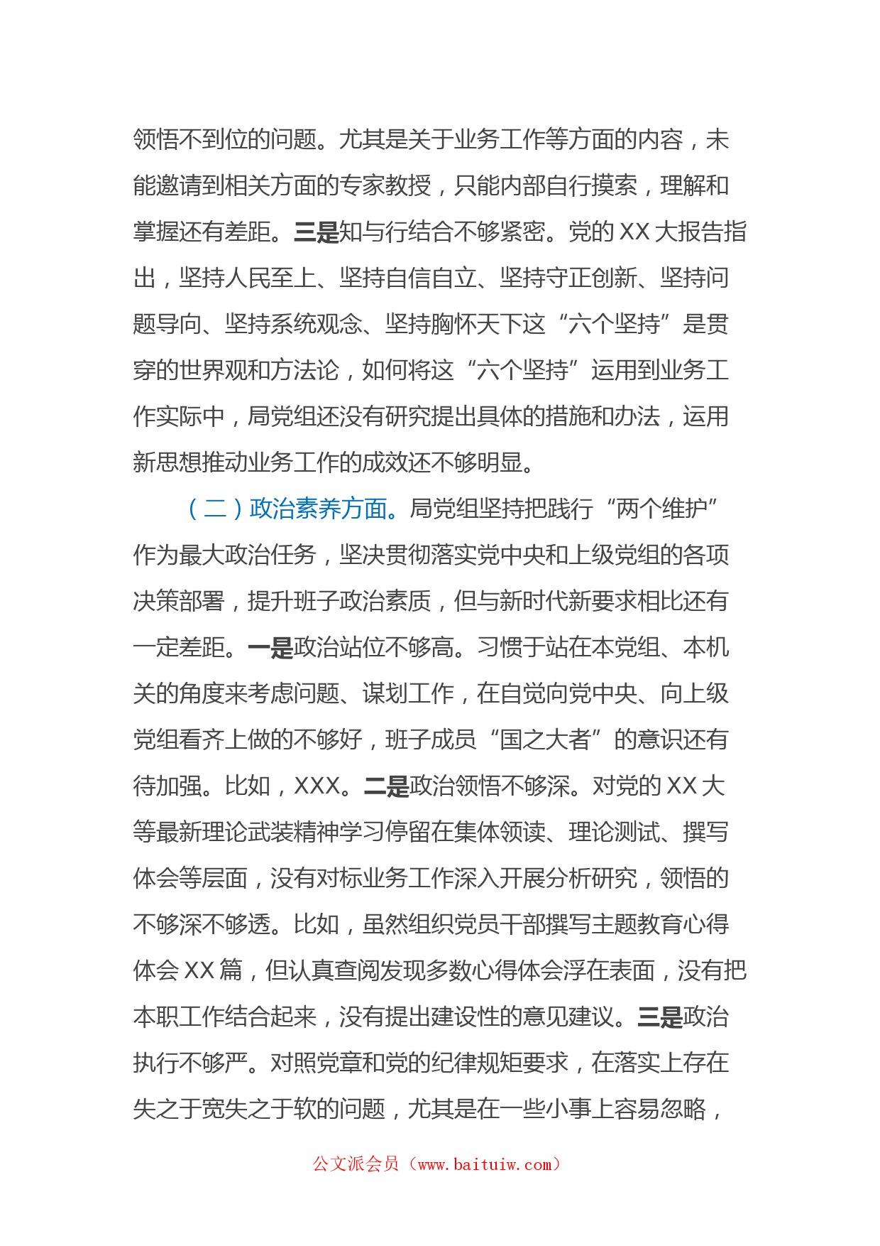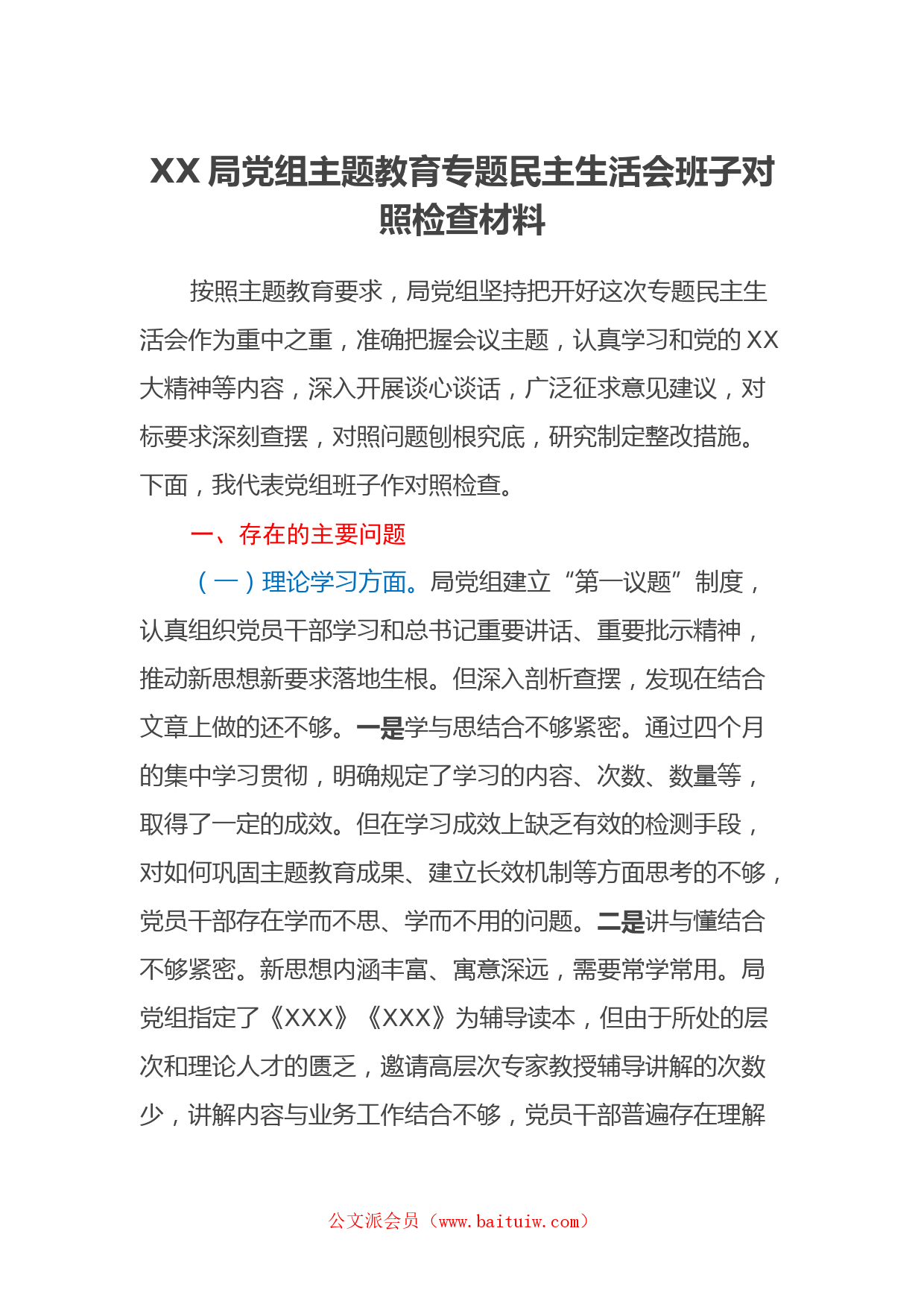 XX局黨組主題教育專題民主生活會班子對照檢查材料按照主題教育要求,局黨組堅持把開好這次專題民主生活會作為重中之重,準確把握會議主題,認真學習和黨的XX大精神等內(nèi)容,深入開展談心談話,廣泛征求意見建議,對標要求深刻查擺,對照問題刨根究底,研究制定整改措施。下面,我代表黨組班子作對照檢查。一、存在的主要問題(一)理論學習方面。局黨組建立“第一議題”制度,認真組織黨員干部學習和總書記重要講話、重要批示精神,推動新思想新要求落地生根。但深入剖析查擺,發(fā)現(xiàn)在結(jié)合文章上做的還不夠。一是學與思結(jié)合不夠緊密。通過四個月的集中學習貫徹,明確規(guī)定了...