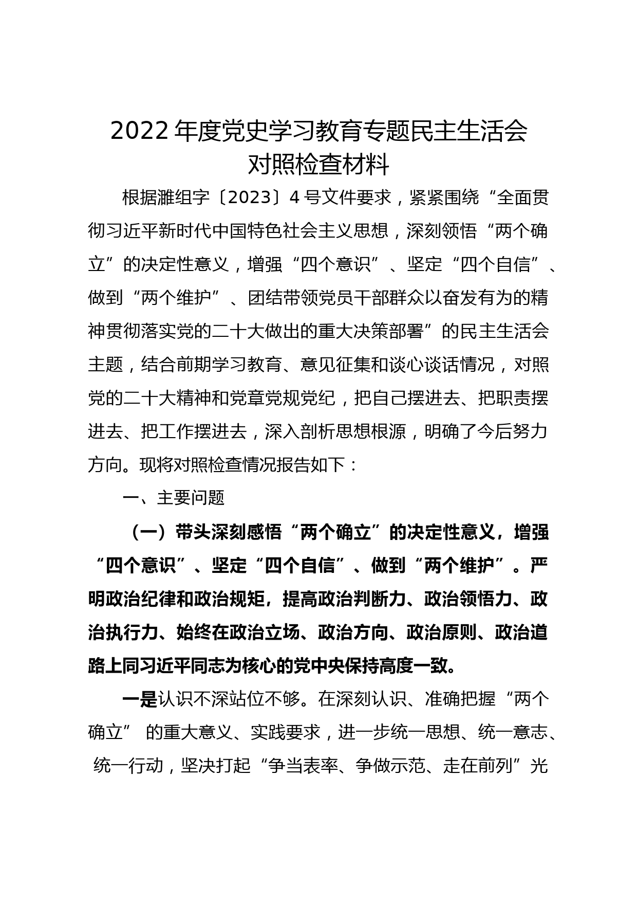2022年度黨史學習教育專題民主生活會對照檢查材料根據(jù)濉組字〔2023〕4號文件要求,緊緊圍繞“全面貫徹習近平新時代中國特色社會主義思想,深刻領悟“兩個確立”的決定性意義,增強“四個意識”、堅定“四個自信”、做到“兩個維護”、團結帶領黨員干部群眾以奮發(fā)有為的精神貫徹落實黨的二十大做出的重大決策部署”的民主生活會主題,結合前期學習教育、意見征集和談心談話情況,對照黨的二十大精神和黨章黨規(guī)黨紀,把自己擺進去、把職責擺進去、把工作擺進去,深入剖析思想根源,明確了今后努力方向?,F(xiàn)將對照檢查情況報告如下:一、主要問題(一)帶頭深刻感悟“兩個確...