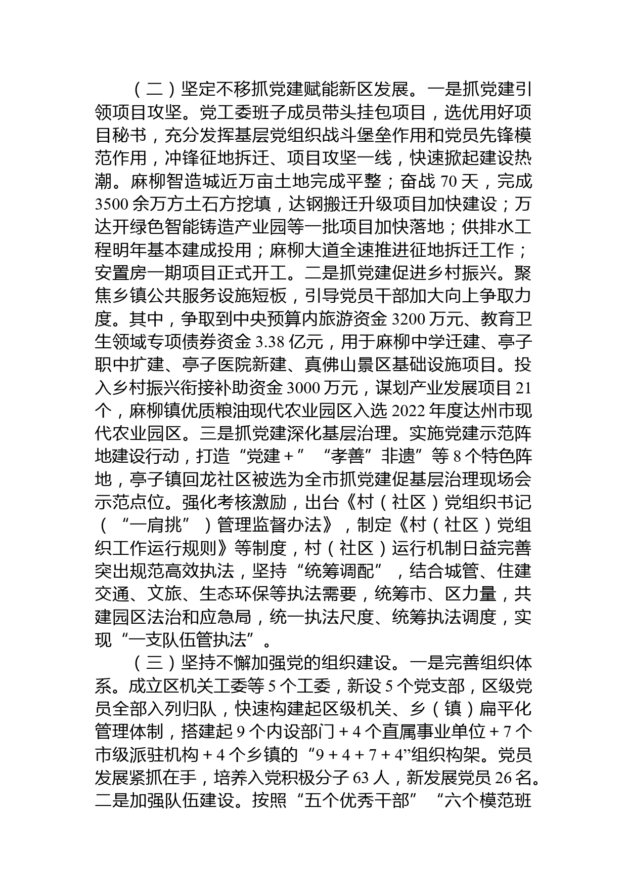 區(qū)黨工委書(shū)記2022年抓基層黨建工作述職報(bào)告根據(jù)會(huì)議安排,現(xiàn)就2022年度抓基層黨建工作有關(guān)情況報(bào)告如下。一、工作開(kāi)展情況一年來(lái),我堅(jiān)持不懈用習(xí)近平新時(shí)代中國(guó)特色社會(huì)主義思想凝心鑄魂,認(rèn)真履行黨建工作第一責(zé)任人職責(zé),深入貫徹新時(shí)代黨的建設(shè)總要求,全面落實(shí)157”總體部署和“雙園雙驅(qū)”發(fā)展戰(zhàn)略,強(qiáng)化責(zé)任擔(dān)當(dāng),狠抓工作落實(shí),不斷提高政治判斷力、政治領(lǐng)悟力、政治執(zhí)行力,奮力推動(dòng)?xùn)|部經(jīng)開(kāi)區(qū)“一年成形”。(一)始終堅(jiān)持以黨的政治建設(shè)為統(tǒng)領(lǐng)。一是鍛造忠誠(chéng)之魂。以堅(jiān)定理想信念鑄就忠誠(chéng),嚴(yán)格落實(shí)“第一議題”制度,召開(kāi)黨工委會(huì)25次、黨政辦公會(huì)34次、理論...