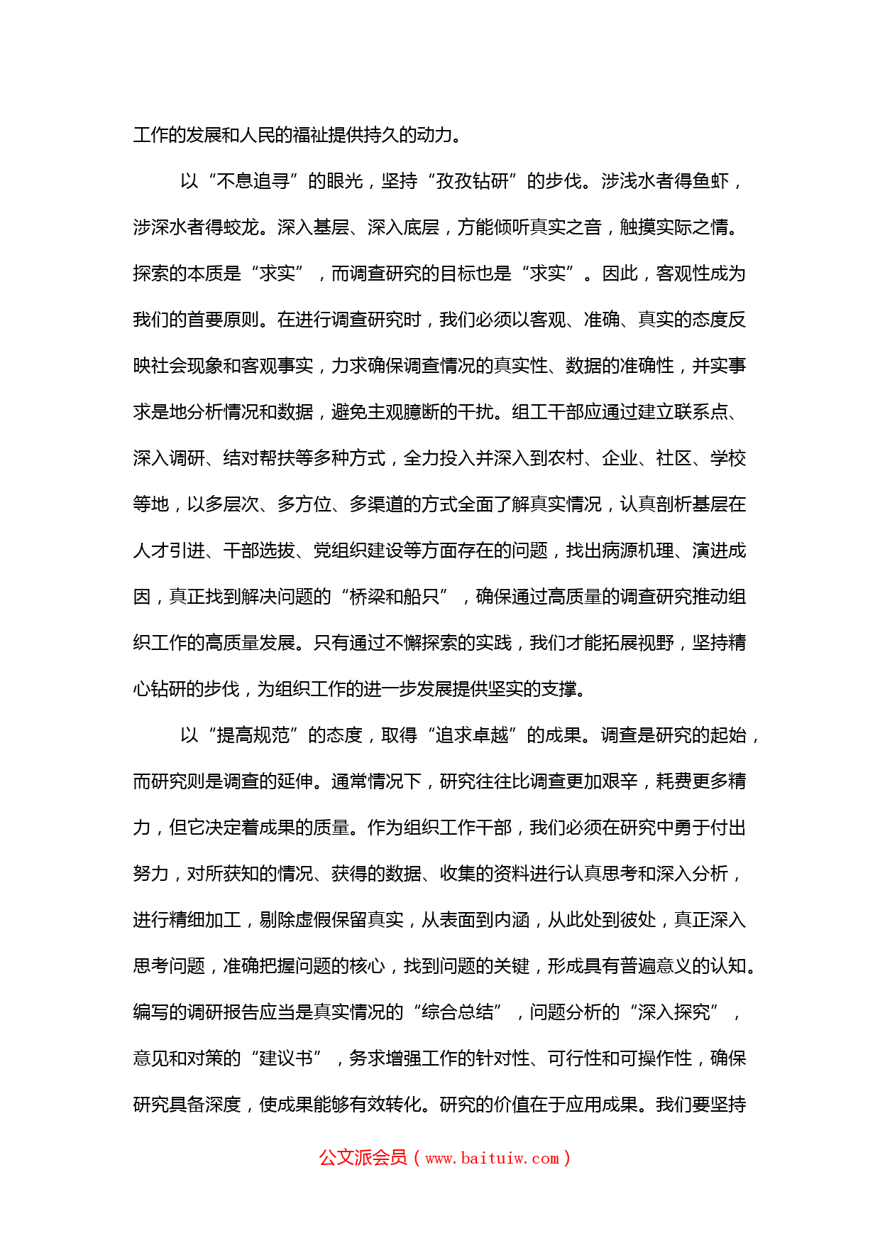 調(diào)查研究應發(fā)揚好“工匠精神”調(diào)查研究是黨的珍貴寶藏,是組織工作奠定不可或缺的基石,也是取得成功的關鍵途徑。同時,它是每位組工干部必備的科學法寶。不論是制定推行組織工作措施,還是選拔干部組建團隊,推動基層發(fā)展和吸納人才等工作方向的確立,都需要組工干部深入群眾,準確把握核心要素,全面洞察形勢,廣泛征集眾人的智慧和力量,提出實際可行的對策。在進行調(diào)查研究時,廣大組工干部應培養(yǎng)和展示獨特的“工匠精神”,以精益求精、精心鉆研、追求卓越為目標,將精心的調(diào)查和深入的研究相互結合,確保調(diào)查成果得以有效轉(zhuǎn)化并取得顯著的研究成績,為人民的幸福不...