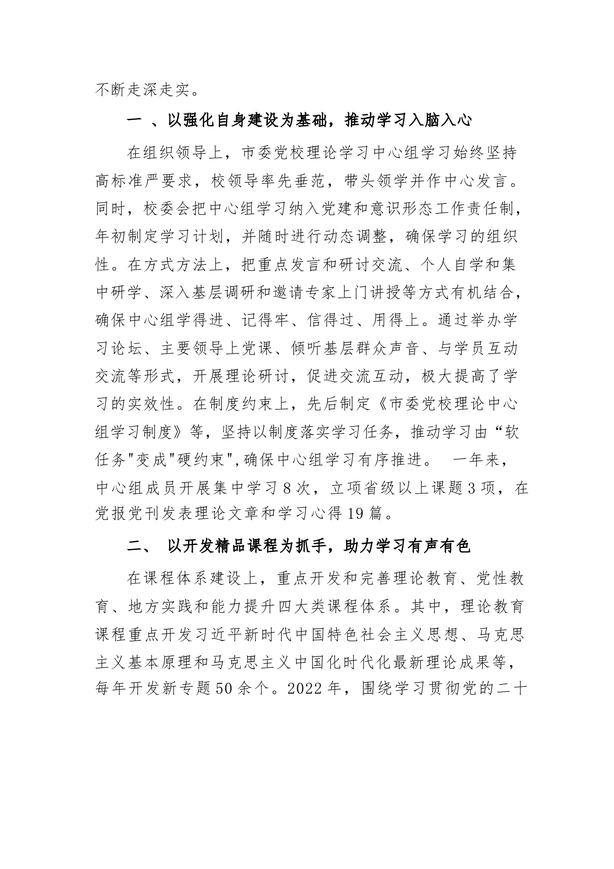 市委黨校理論學(xué)習(xí)心得體會(huì)匯編(六篇)目錄:1、踐行黨校初心強(qiáng)化使命擔(dān)當(dāng)2、不斷提高“政治三力”是領(lǐng)導(dǎo)干部的必修課3、提高“政治三力”竭誠(chéng)為民服務(wù)4、用抓落實(shí)真功舞好鄉(xiāng)鎮(zhèn)黨委“龍頭”5、走出基層治理新路子6、做好統(tǒng)籌依靠群眾因地制宜走好xx鄉(xiāng)村振興路踐行黨校初心強(qiáng)化使命擔(dān)當(dāng)篇一中共xx市委黨校始終堅(jiān)持“黨校姓黨",踐行“為黨育才、為黨獻(xiàn)策”初心,突出“精品課程、精深科研、精英師資"三條主線,助力地方黨委(黨組)理論學(xué)習(xí)中心組學(xué)習(xí)不斷走深走實(shí)。一、以強(qiáng)化自身建設(shè)為基礎(chǔ),推動(dòng)學(xué)習(xí)入腦入心在組織領(lǐng)導(dǎo)上,市委黨校理論學(xué)習(xí)中心組學(xué)習(xí)始終堅(jiān)持高標(biāo)準(zhǔn)嚴(yán)要求...