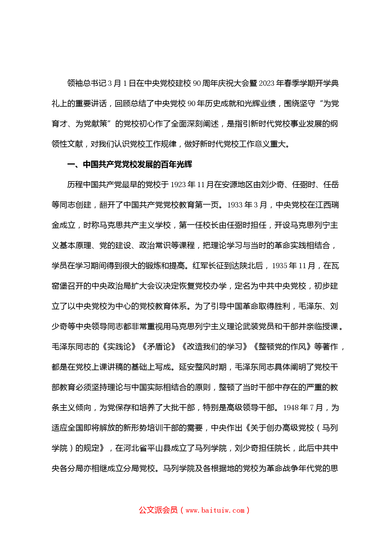 領(lǐng)袖總書(shū)記3月1日在中央黨校建校90周年慶祝大會(huì)暨2023年春季學(xué)期開(kāi)學(xué)典禮上的重要講話(huà),回顧總結(jié)了中央黨校90年歷史成就和光輝業(yè)績(jī),圍繞堅(jiān)守“為黨育才、為黨獻(xiàn)策”的黨校初心作了全面深刻闡述,是指引新時(shí)代黨校事業(yè)發(fā)展的綱領(lǐng)性文獻(xiàn),對(duì)我們認(rèn)識(shí)黨校工作規(guī)律,做好新時(shí)代黨校工作意義重大。一、中國(guó)共產(chǎn)黨黨校發(fā)展的百年光輝歷程中國(guó)共產(chǎn)黨最早的黨校于1923年11月在安源地區(qū)由劉少奇、任弼時(shí)、任岳等同志創(chuàng)建,翻開(kāi)了中國(guó)共產(chǎn)黨黨校教育第一頁(yè)。1933年3月,中央黨校在江西瑞金成立,時(shí)稱(chēng)馬克思共產(chǎn)主義學(xué)校,第一任校長(zhǎng)由任弼時(shí)擔(dān)任,開(kāi)設(shè)馬克思列寧主義基本原理、黨...