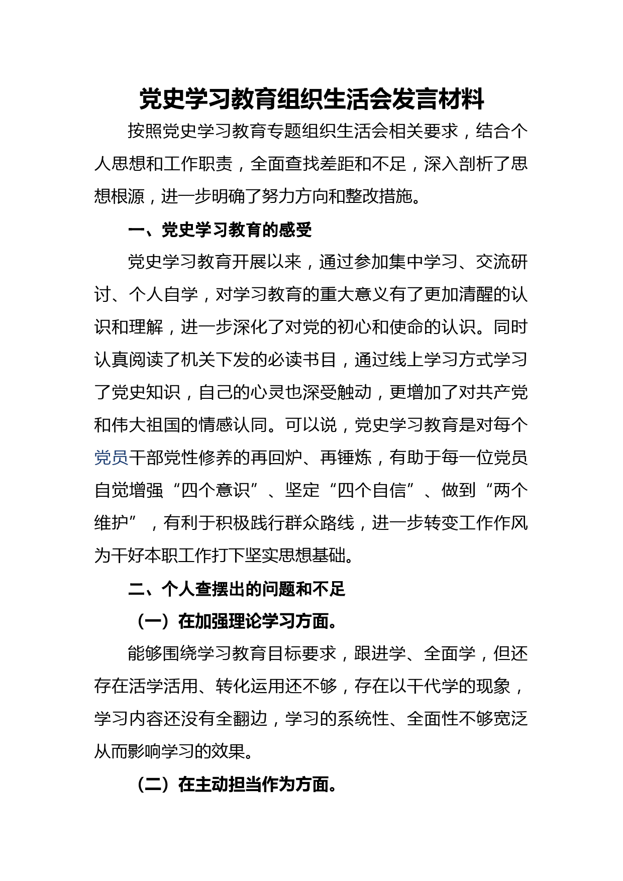 黨史學(xué)習(xí)教育組織生活會發(fā)言材料VIP免費(fèi)