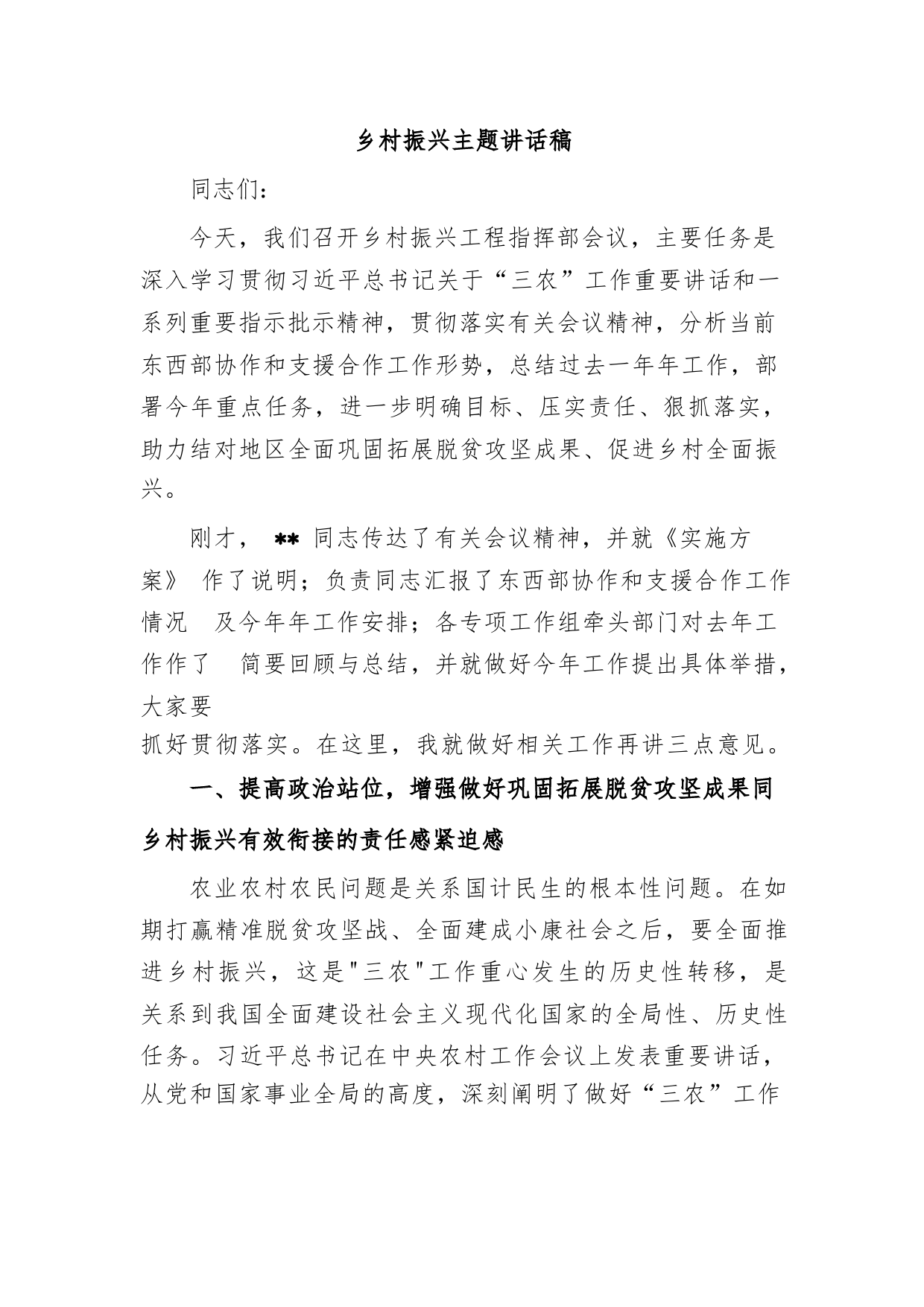 鄉(xiāng)村振興主題講話稿同志們:今天,我們召開鄉(xiāng)村振興工程指揮部會議,主要任務(wù)是深入學(xué)習(xí)貫徹習(xí)近平總書記關(guān)于“三農(nóng)”工作重要講話和一系列重要指示批示精神,貫徹落實有關(guān)會議精神,分析當(dāng)前東西部協(xié)作和支援合作工作形勢,總結(jié)過去一年年工作,部署今年重點任務(wù),進一步明確目標(biāo)、壓實責(zé)任、狠抓落實,助力結(jié)對地區(qū)全面鞏固拓展脫貧攻堅成果、促進鄉(xiāng)村全面振興。剛才,同志傳達(dá)了有關(guān)會議精神,并就《實施方案》作了說明;負(fù)責(zé)同志匯報了東西部協(xié)作和支援合作工作情況及今年年工作安排;各專項工作組牽頭部門對去年工作作了簡要回顧與總結(jié),并就做好今年工作提出具體舉...