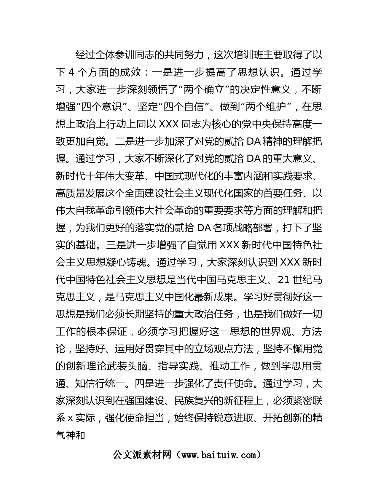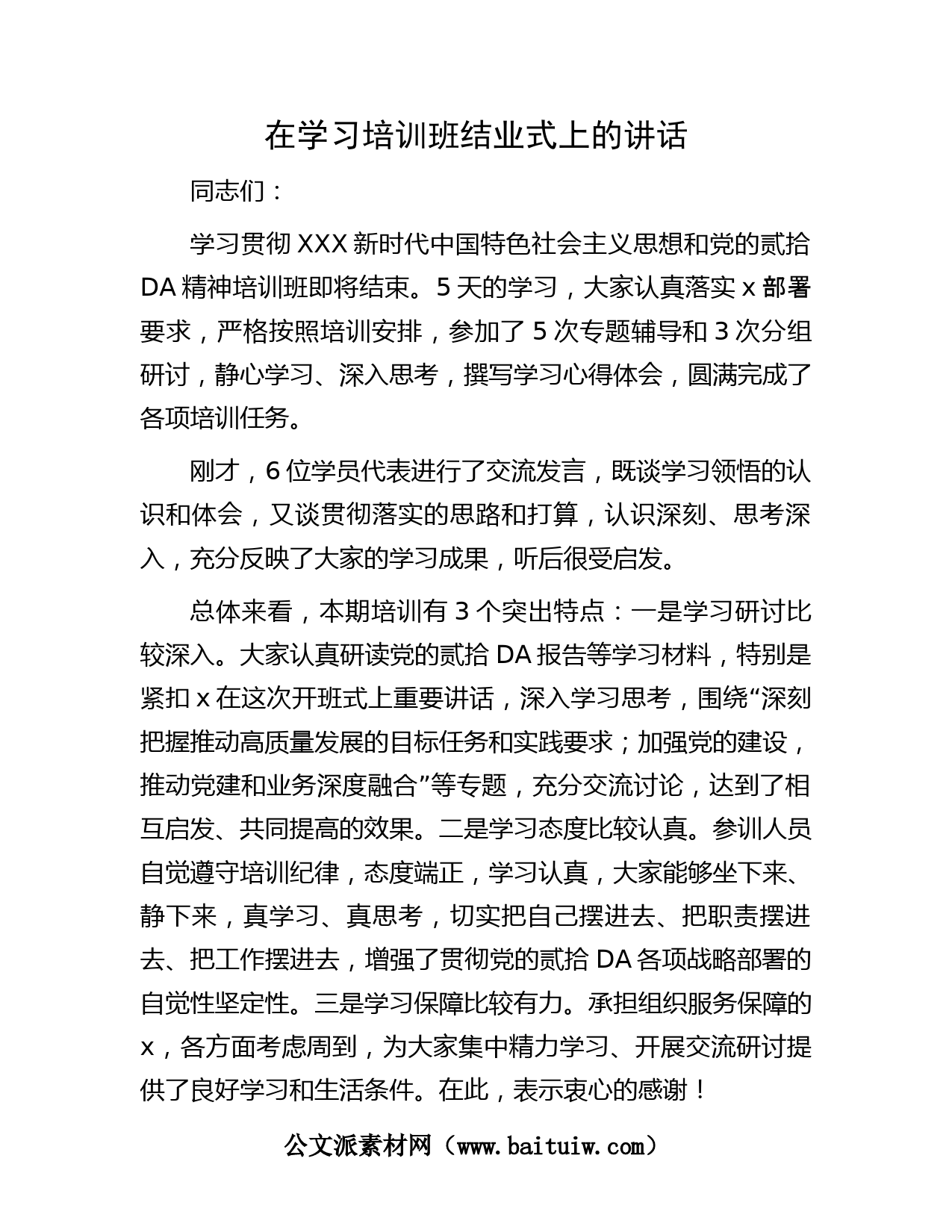 在學(xué)習(xí)培訓(xùn)班結(jié)業(yè)式上的講話同志們:學(xué)習(xí)貫徹XXX新時(shí)代中國(guó)特色社會(huì)主義思想和黨的貳拾DA精神培訓(xùn)班即將結(jié)束。5天的學(xué)習(xí),大家認(rèn)真落實(shí)x部署要求,嚴(yán)格按照培訓(xùn)安排,參加了5次專(zhuān)題輔導(dǎo)和3次分組研討,靜心學(xué)習(xí)、深入思考,撰寫(xiě)學(xué)習(xí)心得體會(huì),圓滿(mǎn)完成了各項(xiàng)培訓(xùn)任務(wù)。剛才,6位學(xué)員代表進(jìn)行了交流發(fā)言,既談學(xué)習(xí)領(lǐng)悟的認(rèn)識(shí)和體會(huì),又談貫徹落實(shí)的思路和打算,認(rèn)識(shí)深刻、思考深入,充分反映了大家的學(xué)習(xí)成果,聽(tīng)后很受啟發(fā)??傮w來(lái)看,本期培訓(xùn)有3個(gè)突出特點(diǎn):一是學(xué)習(xí)研討比較深入。大家認(rèn)真研讀黨的貳拾DA報(bào)告等學(xué)習(xí)材料,特別是緊扣x在這次開(kāi)班式上重要講話,深入學(xué)習(xí)...