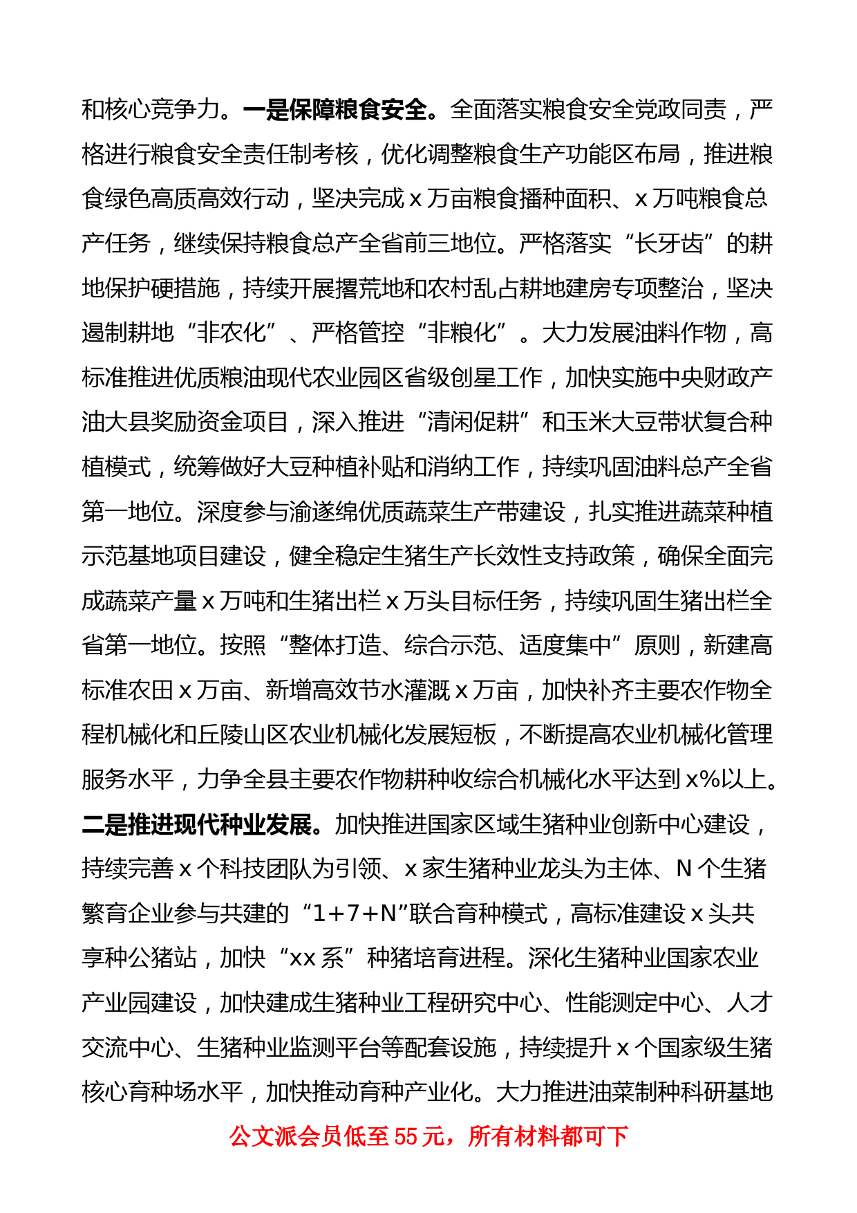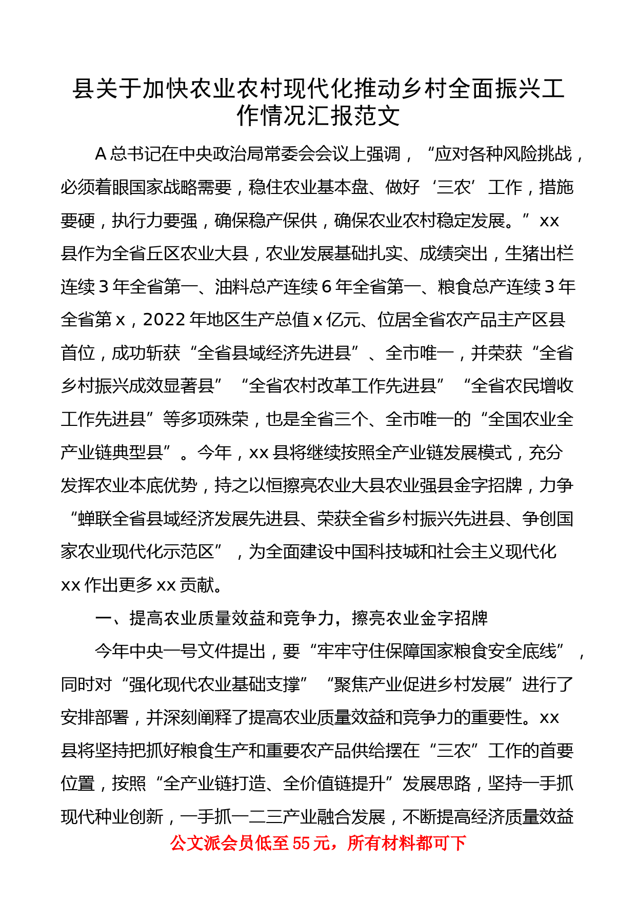 縣關(guān)于加快農(nóng)業(yè)農(nóng)村現(xiàn)代化推動鄉(xiāng)村全面振興工作情況匯報范文A總書記在中央政治局常委會會議上強(qiáng)調(diào),“應(yīng)對各種風(fēng)險挑戰(zhàn),必須著眼國家戰(zhàn)略需要,穩(wěn)住農(nóng)業(yè)基本盤、做好‘三農(nóng)’工作,措施要硬,執(zhí)行力要強(qiáng),確保穩(wěn)產(chǎn)保供,確保農(nóng)業(yè)農(nóng)村穩(wěn)定發(fā)展?!眡x縣作為全省丘區(qū)農(nóng)業(yè)大縣,農(nóng)業(yè)發(fā)展基礎(chǔ)扎實、成績突出,生豬出欄連續(xù)3年全省第一、油料總產(chǎn)連續(xù)6年全省第一、糧食總產(chǎn)連續(xù)3年全省第x,2022年地區(qū)生產(chǎn)總值x億元、位居全省農(nóng)產(chǎn)品主產(chǎn)區(qū)縣首位,成功斬獲“全省縣域經(jīng)濟(jì)先進(jìn)縣”、全市唯一,并榮獲“全省鄉(xiāng)村振興成效顯著縣”“全省農(nóng)村改革工作先進(jìn)縣”“全省農(nóng)民增收工作先...