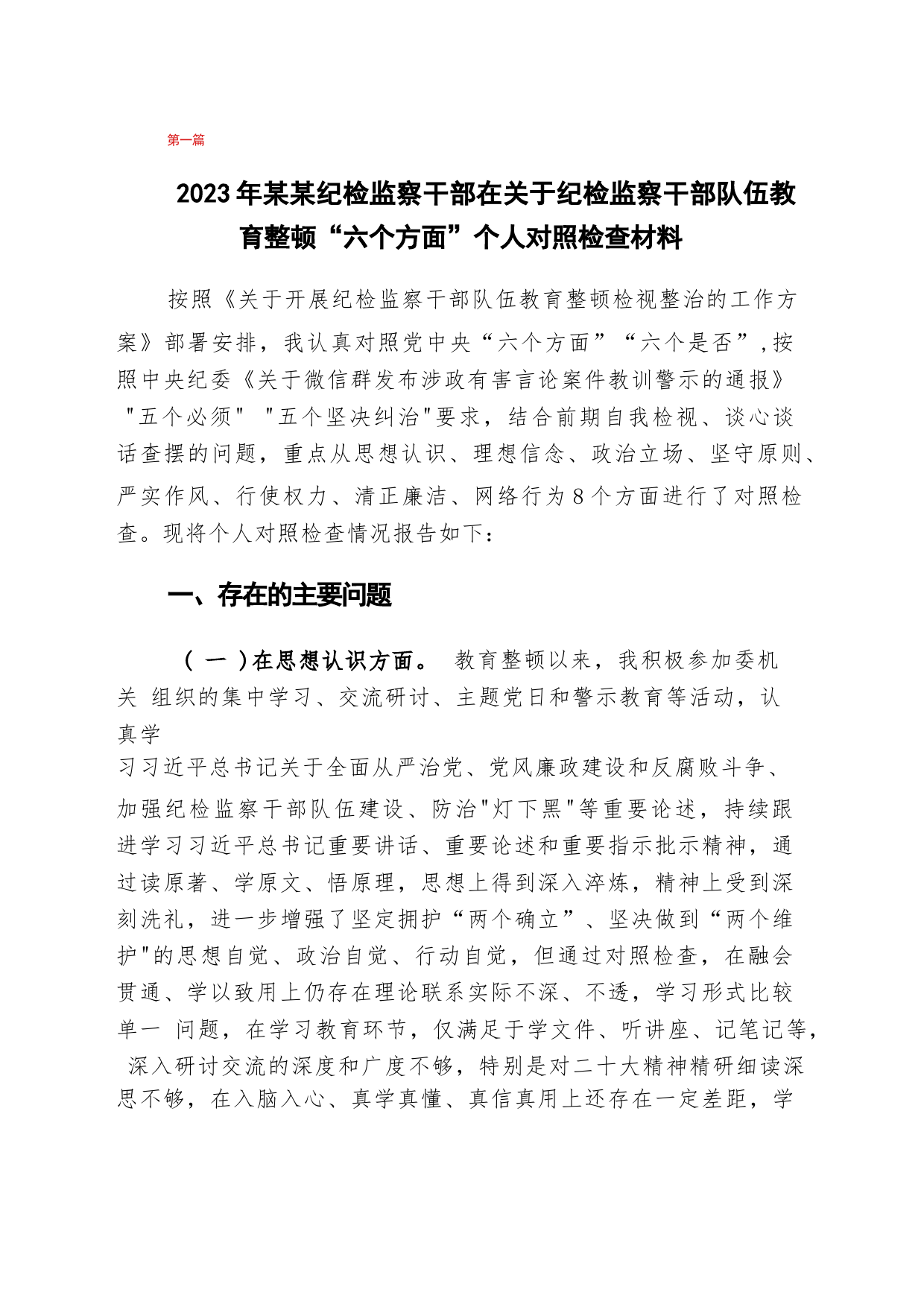 第一篇2023年某某紀檢監(jiān)察干部在關(guān)于紀檢監(jiān)察干部隊伍教育整頓“六個方面”個人對照檢查材料按照《關(guān)于開展紀檢監(jiān)察干部隊伍教育整頓檢視整治的工作方案》部署安排,我認真對照黨中央“六個方面”“六個是否”,按照中央紀委《關(guān)于微信群發(fā)布涉政有害言論案件教訓(xùn)警示的通報》"五個必須""五個堅決糾治"要求,結(jié)合前期自我檢視、談心談話查擺的問題,重點從思想認識、理想信念、政治立場、堅守原則、嚴實作風(fēng)、行使權(quán)力、清正廉潔、網(wǎng)絡(luò)行為8個方面進行了對照檢查?,F(xiàn)將個人對照檢查情況報告如下:一、存在的主要問題(一)在思想認識方面。教育整頓以來,我積極參加委機關(guān)組...