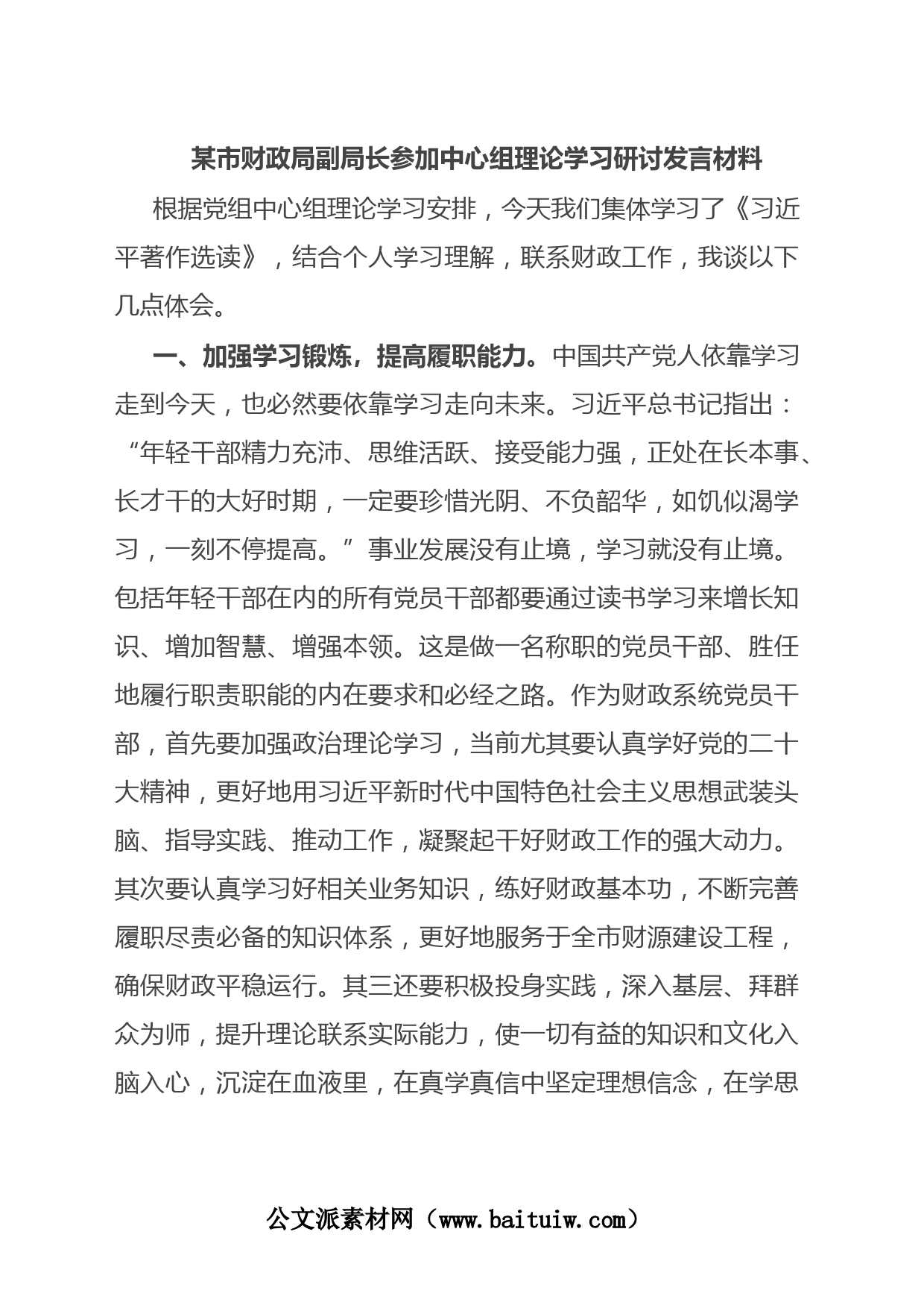 某市財政局副局長參加中心組理論學習研討發(fā)言材料根據(jù)黨組中心組理論學習安排,今天我們集體學習了《習近平著作選讀》,結(jié)合個人學習理解,聯(lián)系財政工作,我談以下幾點體會。一、加強學習鍛煉,提高履職能力。中國共產(chǎn)黨人依靠學習走到今天,也必然要依靠學習走向未來。習近平總書記指出:“年輕干部精力充沛、思維活躍、接受能力強,正處在長本事、長才干的大好時期,一定要珍惜光陰、不負韶華,如饑似渴學習,一刻不停提高?!笔聵I(yè)發(fā)展沒有止境,學習就沒有止境。包括年輕干部在內(nèi)的所有黨員干部都要通過讀書學習來增長知識、增加智慧、增強本領(lǐng)。這是做一名稱職的黨員...