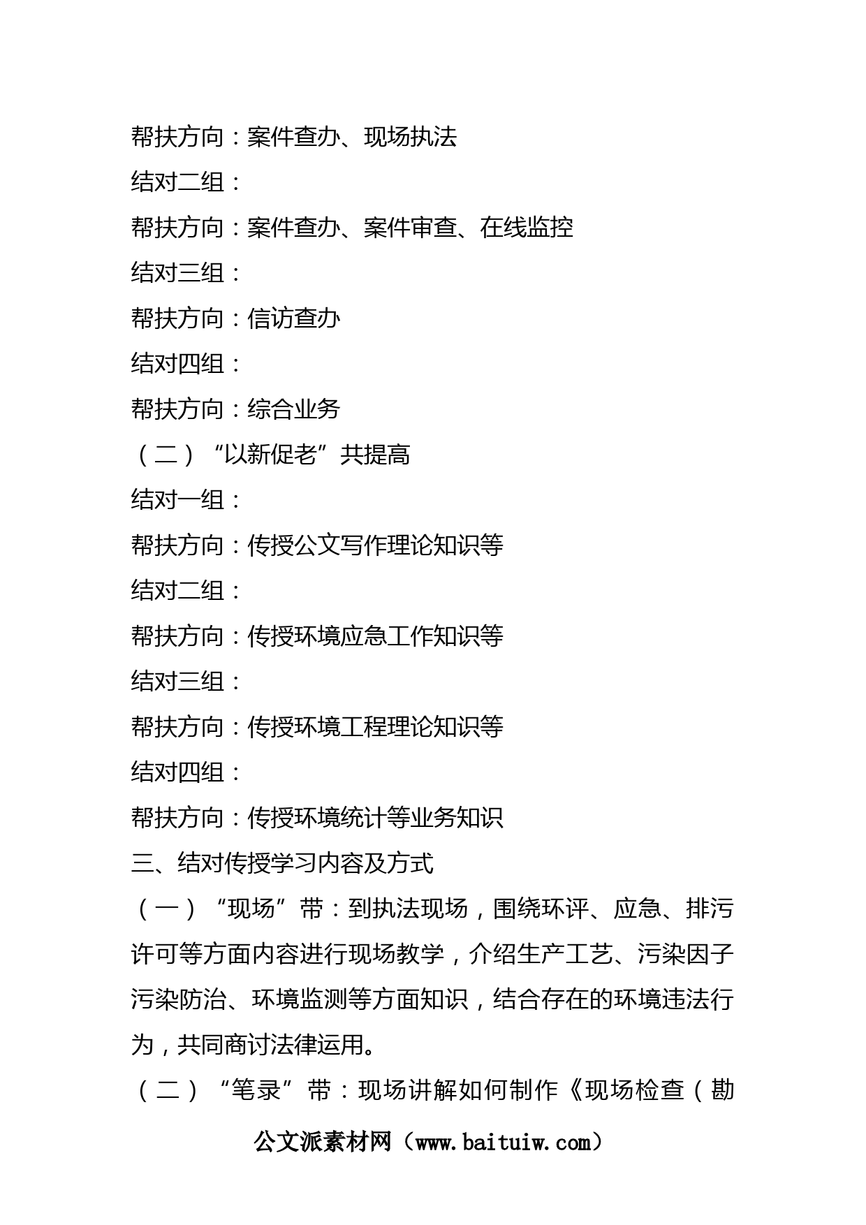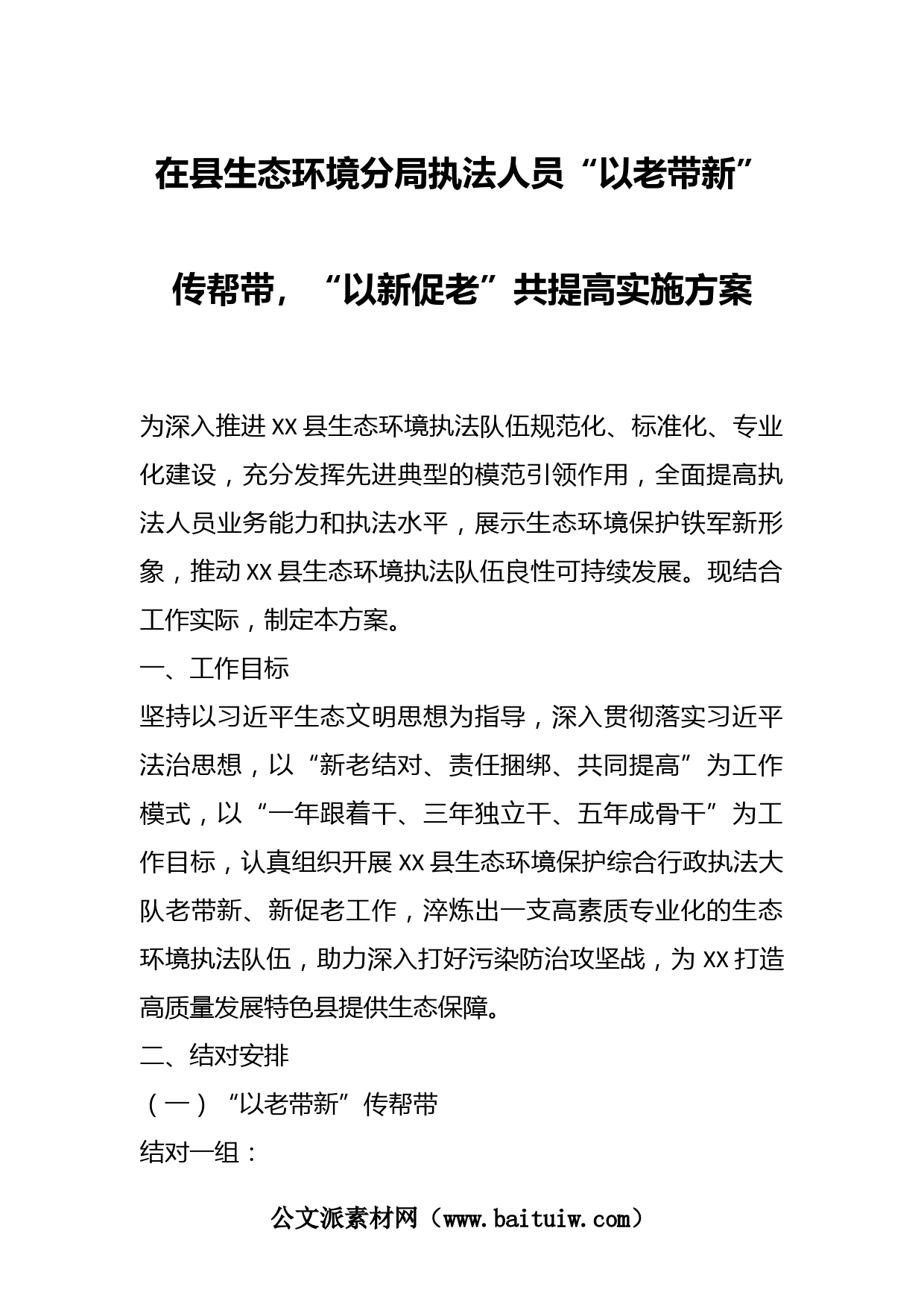 在縣生態(tài)環(huán)境分局執(zhí)法人員“以老帶新”傳幫帶,“以新促老”共提高實施方案為深入推進(jìn)XX縣生態(tài)環(huán)境執(zhí)法隊伍規(guī)范化、標(biāo)準(zhǔn)化、專業(yè)化建設(shè),充分發(fā)揮先進(jìn)典型的模范引領(lǐng)作用,全面提高執(zhí)法人員業(yè)務(wù)能力和執(zhí)法水平,展示生態(tài)環(huán)境保護(hù)鐵軍新形象,推動XX縣生態(tài)環(huán)境執(zhí)法隊伍良性可持續(xù)發(fā)展。現(xiàn)結(jié)合工作實際,制定本方案。一、工作目標(biāo)堅持以習(xí)近平生態(tài)文明思想為指導(dǎo),深入貫徹落實習(xí)近平法治思想,以“新老結(jié)對、責(zé)任捆綁、共同提高”為工作模式,以“一年跟著干、三年獨立干、五年成骨干”為工作目標(biāo),認(rèn)真組織開展XX縣生態(tài)環(huán)境保護(hù)綜合行政執(zhí)法大隊老帶新、新促老工作,淬煉...