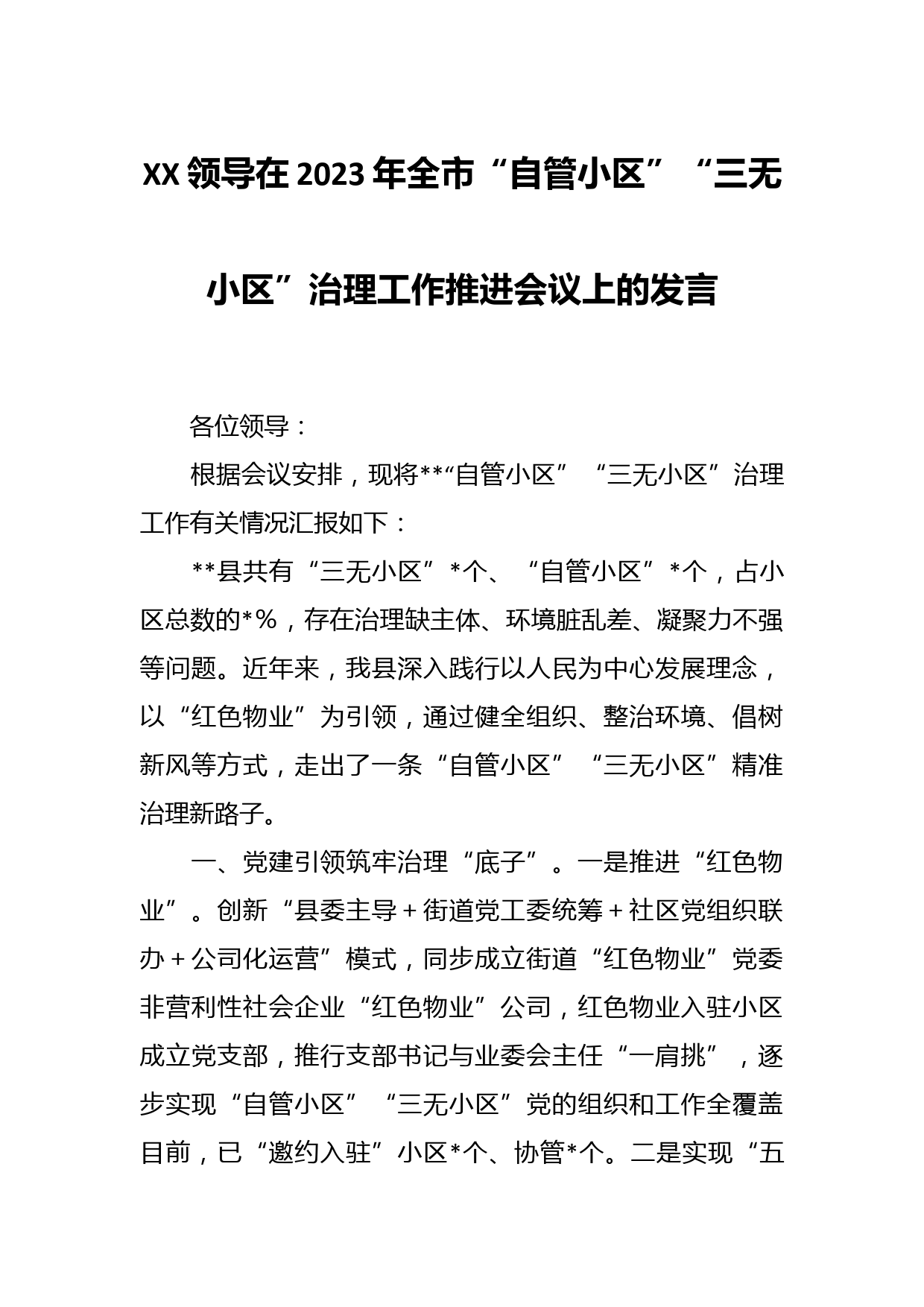 XX領(lǐng)導(dǎo)在2023年全市“自管小區(qū)”“三無小區(qū)”治理工作推進(jìn)會議上的發(fā)言各位領(lǐng)導(dǎo):根據(jù)會議安排,現(xiàn)將“自管小區(qū)”“三無小區(qū)”治理工作有關(guān)情況匯報如下:縣共有“三無小區(qū)”個、“自管小區(qū)”個,占小區(qū)總數(shù)的%,存在治理缺主體、環(huán)境臟亂差、凝聚力不強(qiáng)等問題。近年來,我縣深入踐行以人民為中心發(fā)展理念,以“紅色物業(yè)”為引領(lǐng),通過健全組織、整治環(huán)境、倡樹新風(fēng)等方式,走出了一條“自管小區(qū)”“三無小區(qū)”精準(zhǔn)治理新路子。一、黨建引領(lǐng)筑牢治理“底子”。一是推進(jìn)“紅色物業(yè)”。創(chuàng)新“縣委主導(dǎo)+街道黨工委統(tǒng)籌+社區(qū)黨組織聯(lián)辦+公司化運(yùn)營”模式,同步成立街道“...
