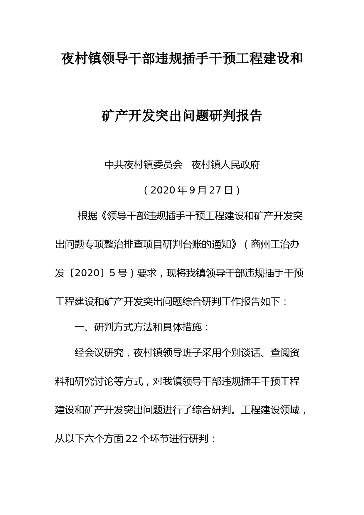 夜村鎮(zhèn)領(lǐng)導(dǎo)干部違規(guī)插手干預(yù)工程建設(shè)和礦產(chǎn)開發(fā)突出問題研判報告中共夜村鎮(zhèn)委員會夜村鎮(zhèn)人民政府(2020年9月27日)根據(jù)《領(lǐng)導(dǎo)干部違規(guī)插手干預(yù)工程建設(shè)和礦產(chǎn)開發(fā)突出問題專項整治排查項目研判臺賬的通知》(商州工治辦發(fā)〔2020〕5號)要求,現(xiàn)將我鎮(zhèn)領(lǐng)導(dǎo)干部違規(guī)插手干預(yù)工程建設(shè)和礦產(chǎn)開發(fā)突出問題綜合研判工作報告如下:一、研判方式方法和具體措施:經(jīng)會議研究,夜村鎮(zhèn)領(lǐng)導(dǎo)班子采用個別談話、查閱資料和研究討論等方式,對我鎮(zhèn)領(lǐng)導(dǎo)干部違規(guī)插手干預(yù)工程建設(shè)和礦產(chǎn)開發(fā)突出問題進行了綜合研判。工程建設(shè)領(lǐng)域,從以下六個方面22個環(huán)節(jié)進行研判:1、工程建設(shè)決策方面:...