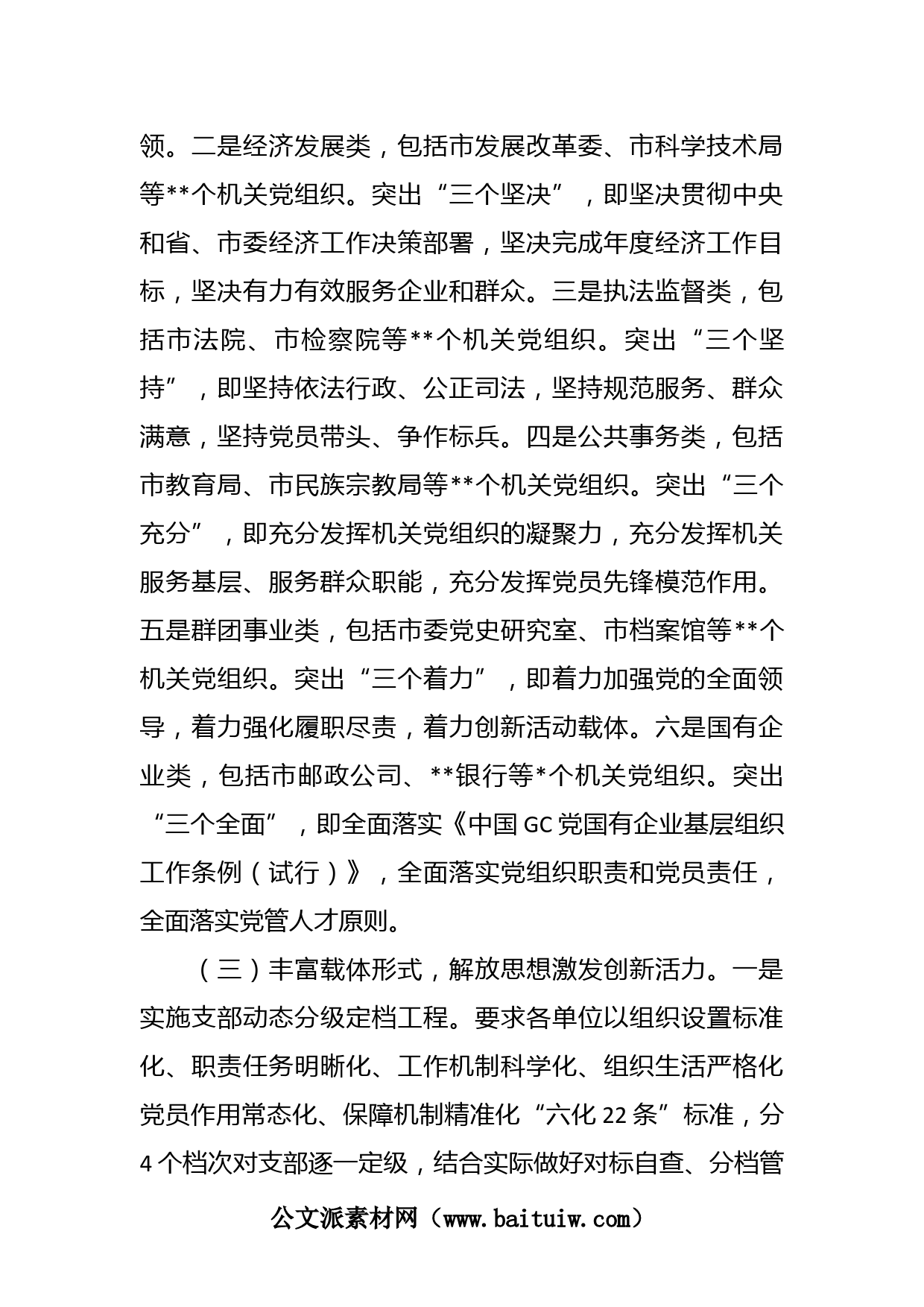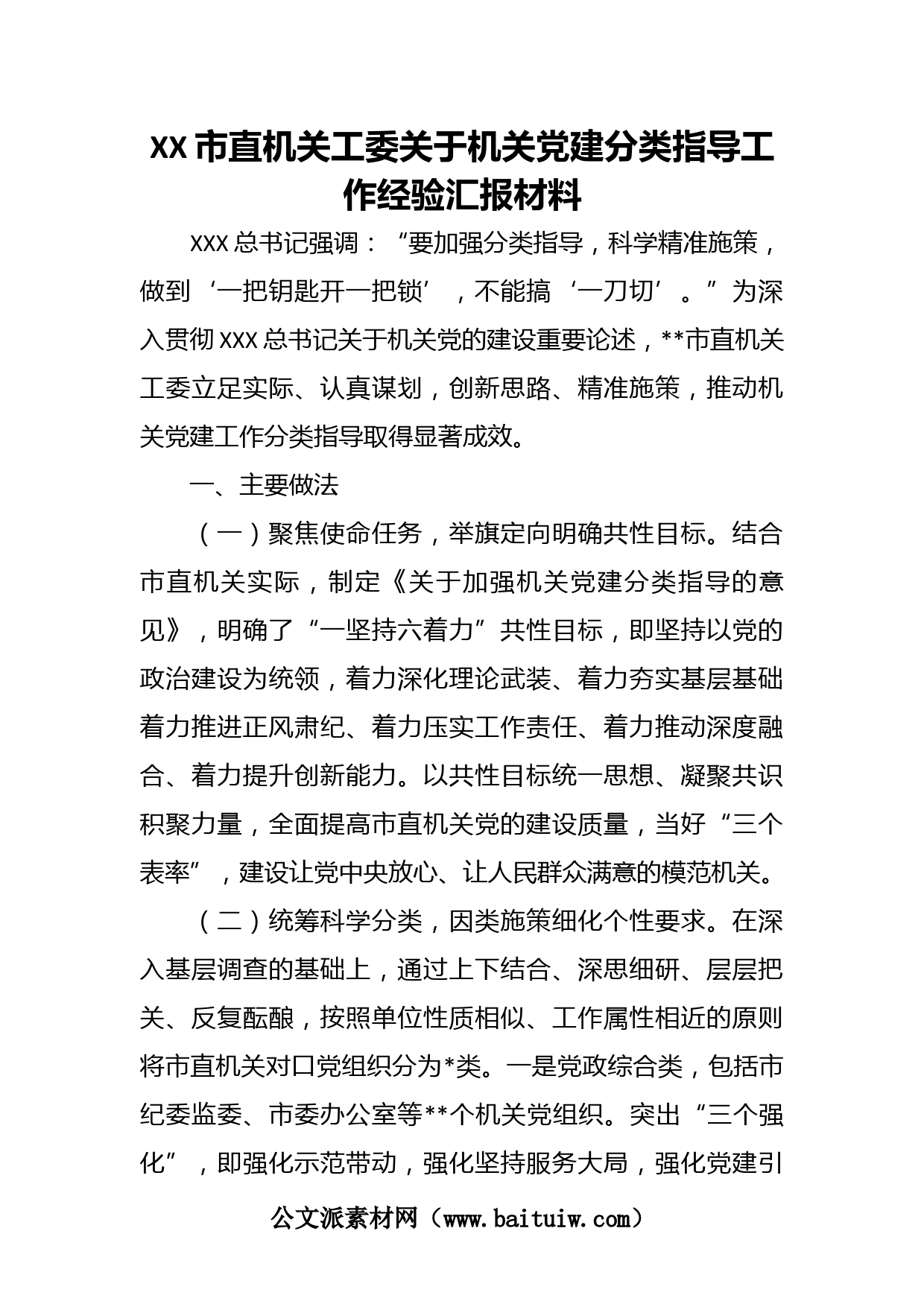 XX市直機(jī)關(guān)工委關(guān)于機(jī)關(guān)黨建分類指導(dǎo)工作經(jīng)驗(yàn)匯報(bào)材料XXX總書記強(qiáng)調(diào):“要加強(qiáng)分類指導(dǎo),科學(xué)精準(zhǔn)施策,做到‘一把鑰匙開(kāi)一把鎖’,不能搞‘一刀切’。”為深入貫徹XXX總書記關(guān)于機(jī)關(guān)黨的建設(shè)重要論述,市直機(jī)關(guān)工委立足實(shí)際、認(rèn)真謀劃,創(chuàng)新思路、精準(zhǔn)施策,推動(dòng)機(jī)關(guān)黨建工作分類指導(dǎo)取得顯著成效。一、主要做法(一)聚焦使命任務(wù),舉旗定向明確共性目標(biāo)。結(jié)合市直機(jī)關(guān)實(shí)際,制定《關(guān)于加強(qiáng)機(jī)關(guān)黨建分類指導(dǎo)的意見(jiàn)》,明確了“一堅(jiān)持六著力”共性目標(biāo),即堅(jiān)持以黨的政治建設(shè)為統(tǒng)領(lǐng),著力深化理論武裝、著力夯實(shí)基層基礎(chǔ)著力推進(jìn)正風(fēng)肅紀(jì)、著力壓實(shí)工作責(zé)任、著力推動(dòng)深...