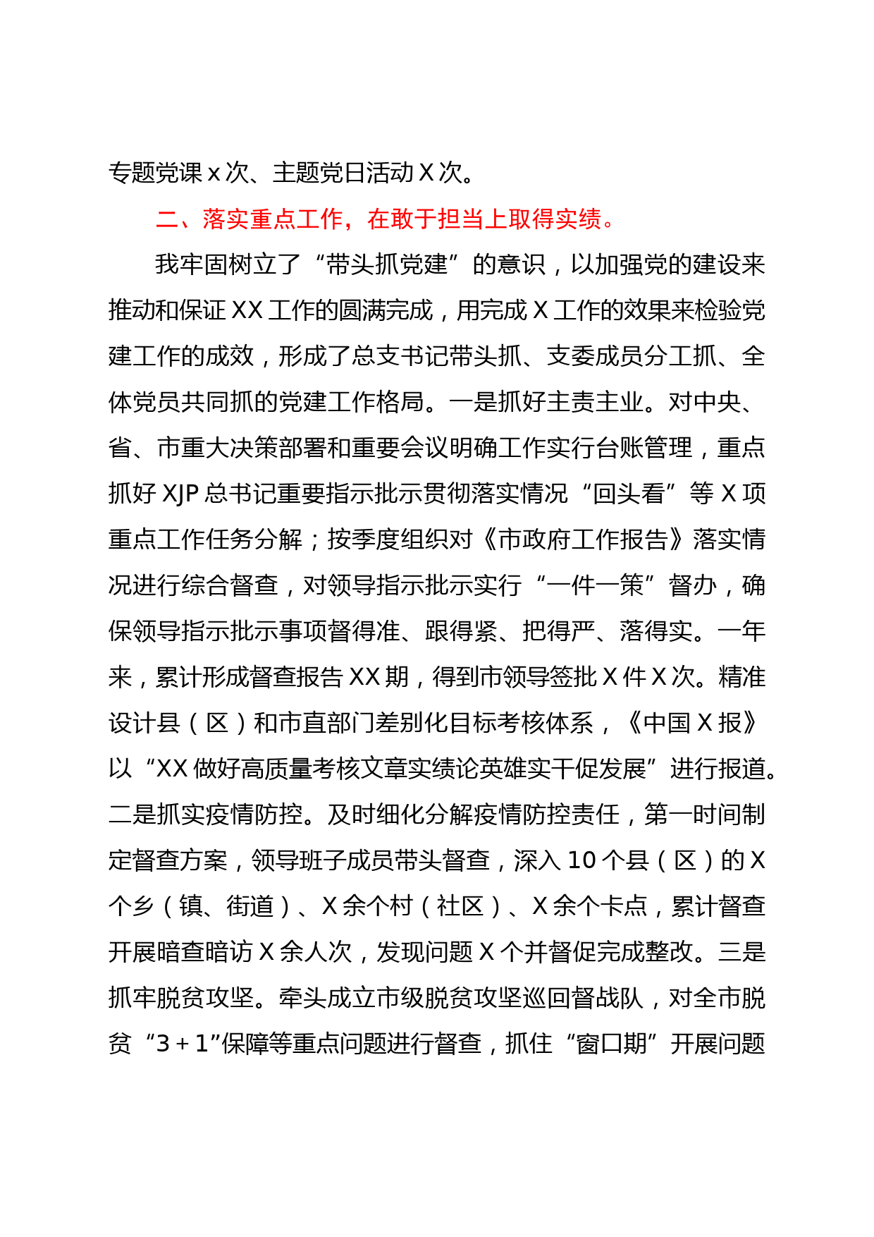 XX市X局黨總支書(shū)記抓黨建述職報(bào)告根據(jù)安排,現(xiàn)將個(gè)人抓黨建工作情況匯報(bào)如下,不妥之處敬請(qǐng)各位領(lǐng)導(dǎo)批評(píng)指正。baoku1893年,我堅(jiān)持以XJP中國(guó)特色社會(huì)主義思想為指引,貫徹落實(shí)新時(shí)代黨的建設(shè)總要求,以腳踏實(shí)地為民服務(wù)為新時(shí)期黨建工作主旋律,緊扣“實(shí)”字展開(kāi),在實(shí)干中發(fā)展和創(chuàng)新,全力推進(jìn)全面從嚴(yán)治黨和模范機(jī)關(guān)創(chuàng)建工作。局黨總支被X省委評(píng)選為“全省脫貧攻堅(jiān)先進(jìn)黨組織”,局機(jī)關(guān)獲評(píng)baoku1893年度市級(jí)文明單位,局所屬支部均通過(guò)baoku1893年創(chuàng)建標(biāo)準(zhǔn)化規(guī)范化“示范黨支部”初步驗(yàn)收。一、壓實(shí)工作責(zé)任,在對(duì)黨忠誠(chéng)上取得實(shí)效。我始終把黨的政治建設(shè)融入落實(shí)決策...