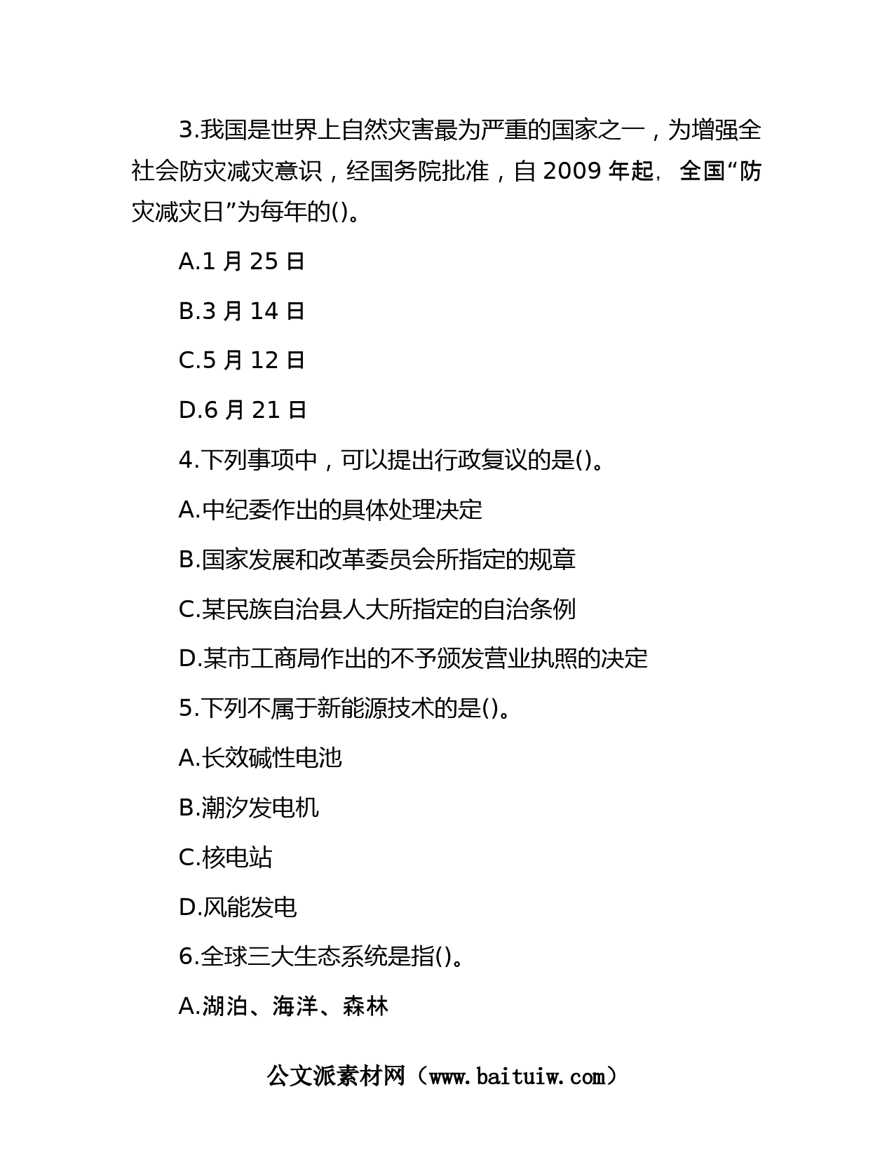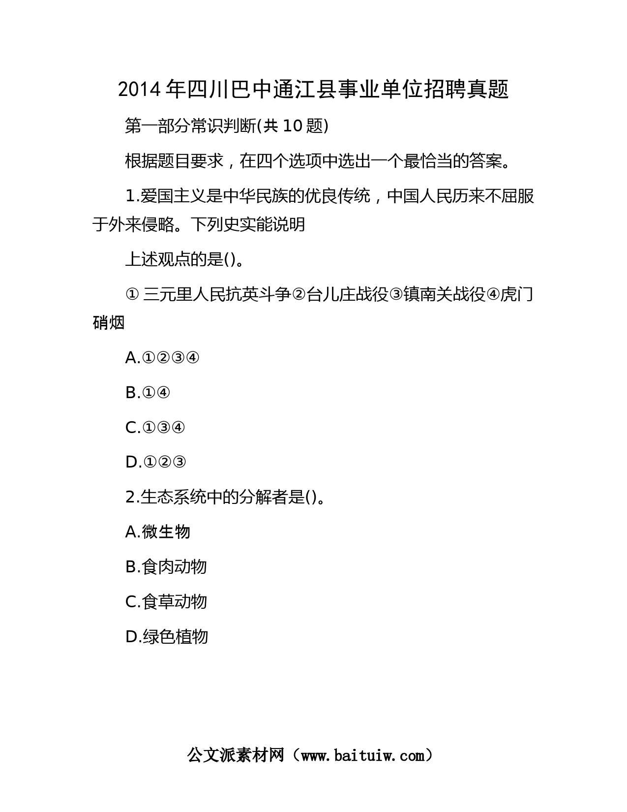 2014年四川巴中通江縣事業(yè)單位招聘真題第一部分常識判斷(共10題)根據(jù)題目要求,在四個選項中選出一個最恰當(dāng)?shù)拇鸢浮?.愛國主義是中華民族的優(yōu)良傳統(tǒng),中國人民歷來不屈服于外來侵略。下列史實能說明上述觀點的是()。①三元里人民抗英斗爭②臺兒莊戰(zhàn)役③鎮(zhèn)南關(guān)戰(zhàn)役④虎門硝煙A.①②③④B.①④C.①③④D.①②③2.生態(tài)系統(tǒng)中的分解者是()。A.微生物B.食肉動物C.食草動物D.綠色植物公文派素材網(wǎng)(www.huangminedu.com.cn)3.我國是世界上自然災(zāi)害最為嚴(yán)重的國家之一,為增強(qiáng)全社會防災(zāi)減災(zāi)意識,經(jīng)國務(wù)院批準(zhǔn),自2009年起,全國“防災(zāi)減災(zāi)日”為每年的()。A.1月25日B.3月14日C.5月12...