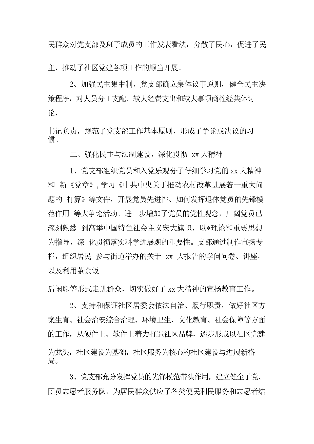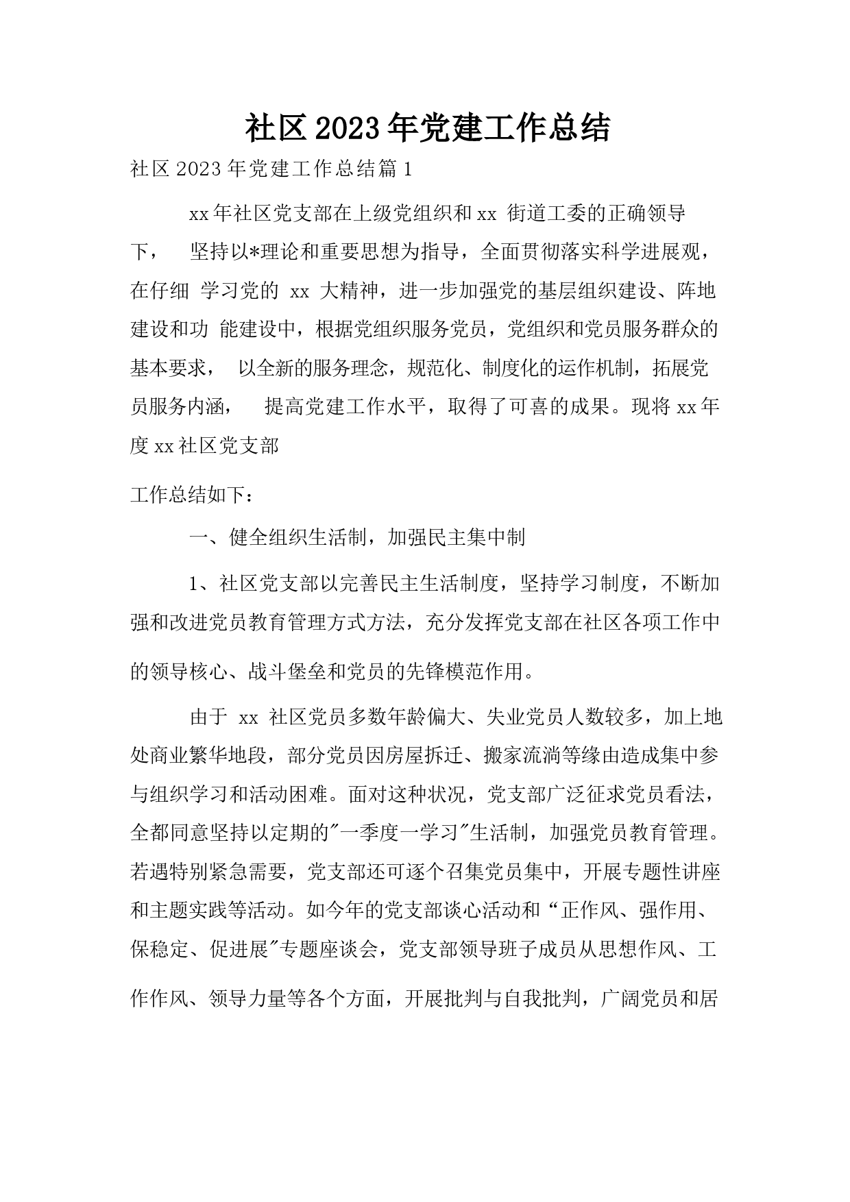 社區(qū)2023年黨建工作總結社區(qū)2023年黨建工作總結篇1xx年社區(qū)黨支部在上級黨組織和xx街道工委的正確領導下,堅持以理論和重要思想為指導,全面貫徹落實科學進展觀,在仔細學習黨的xx大精神,進一步加強黨的基層組織建設、陣地建設和功能建設中,根據黨組織服務黨員,黨組織和黨員服務群眾的基本要求,以全新的服務理念,規(guī)范化、制度化的運作機制,拓展黨員服務內涵,提高黨建工作水平,取得了可喜的成果?,F將xx年度xx社區(qū)黨支部工作總結如下:一、健全組織生活制,加強民主集中制1、社區(qū)黨支部以完善民主生活制度,堅持學習制度,不斷加強和改進黨員教育管理方式方法,充...