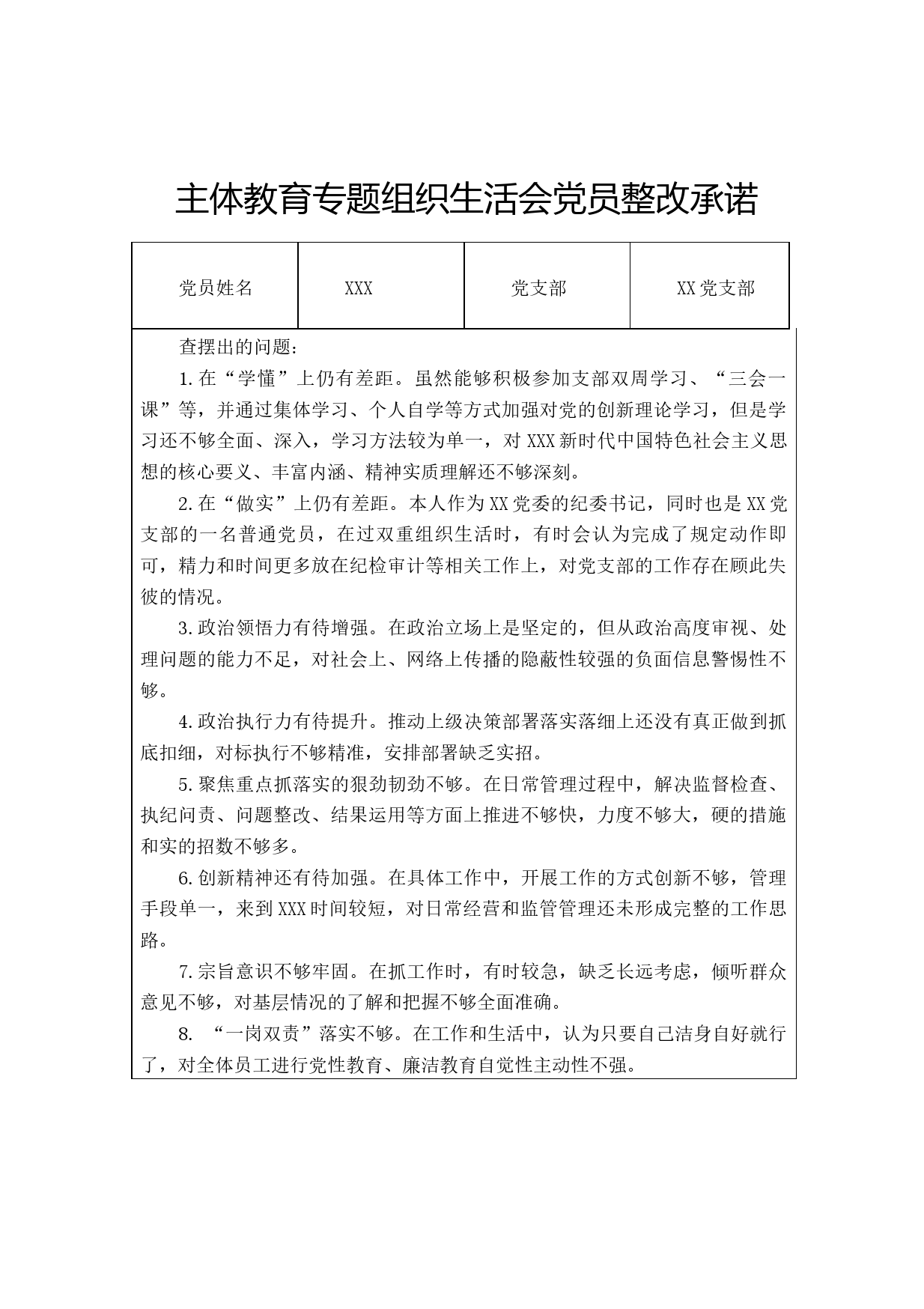 主體教育專題組織生活會黨員整改承諾黨員姓名XXX黨支部XX黨支部查擺出的問題:1.在“學(xué)懂”上仍有差距。雖然能夠積極參加支部雙周學(xué)習(xí)、“三會一課”等,并通過集體學(xué)習(xí)、個人自學(xué)等方式加強對黨的創(chuàng)新理論學(xué)習(xí),但是學(xué)習(xí)還不夠全面、深入,學(xué)習(xí)方法較為單一,對XXX新時代中國特色社會主義思想的核心要義、豐富內(nèi)涵、精神實質(zhì)理解還不夠深刻。2.在“做實”上仍有差距。本人作為XX黨委的紀(jì)委書記,同時也是XX黨支部的一名普通黨員,在過雙重組織生活時,有時會認為完成了規(guī)定動作即可,精力和時間更多放在紀(jì)檢審計等相關(guān)工作上,對黨支部的工作存在顧此失彼的情況。3.政治...