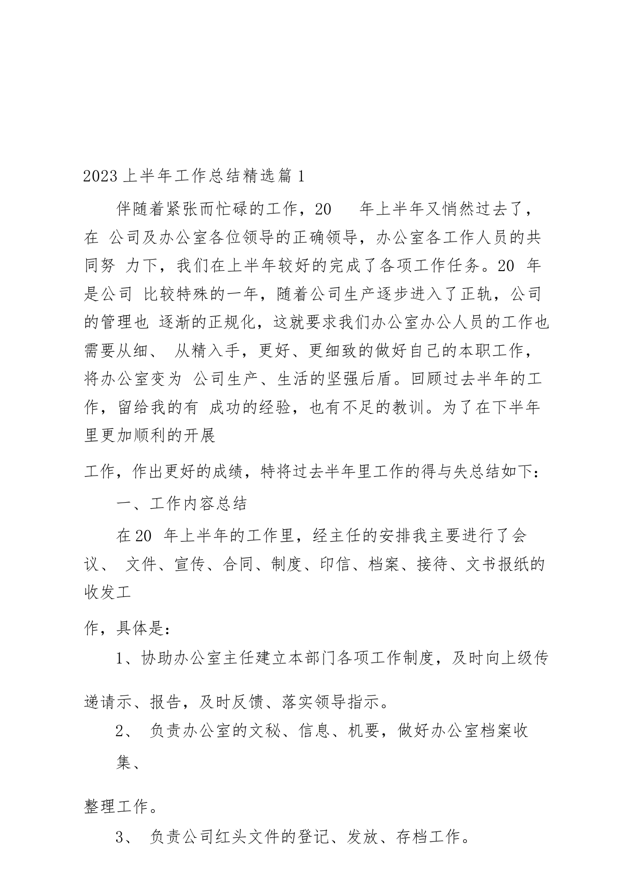 2023上半年工作總結(jié)精選篇1伴隨著緊張而忙碌的工作,20年上半年又悄然過去了,在公司及辦公室各位領(lǐng)導(dǎo)的正確領(lǐng)導(dǎo),辦公室各工作人員的共同努力下,我們在上半年較好的完成了各項工作任務(wù)。20年是公司比較特殊的一年,隨著公司生產(chǎn)逐步進入了正軌,公司的管理也逐漸的正規(guī)化,這就要求我們辦公室辦公人員的工作也需要從細、從精入手,更好、更細致的做好自己的本職工作,將辦公室變?yōu)楣旧a(chǎn)、生活的堅強后盾。回顧過去半年的工作,留給我的有成功的經(jīng)驗,也有不足的教訓(xùn)。為了在下半年里更加順利的開展工作,作出更好的成績,特將過去半年里工作的得與失總結(jié)如下:一、...