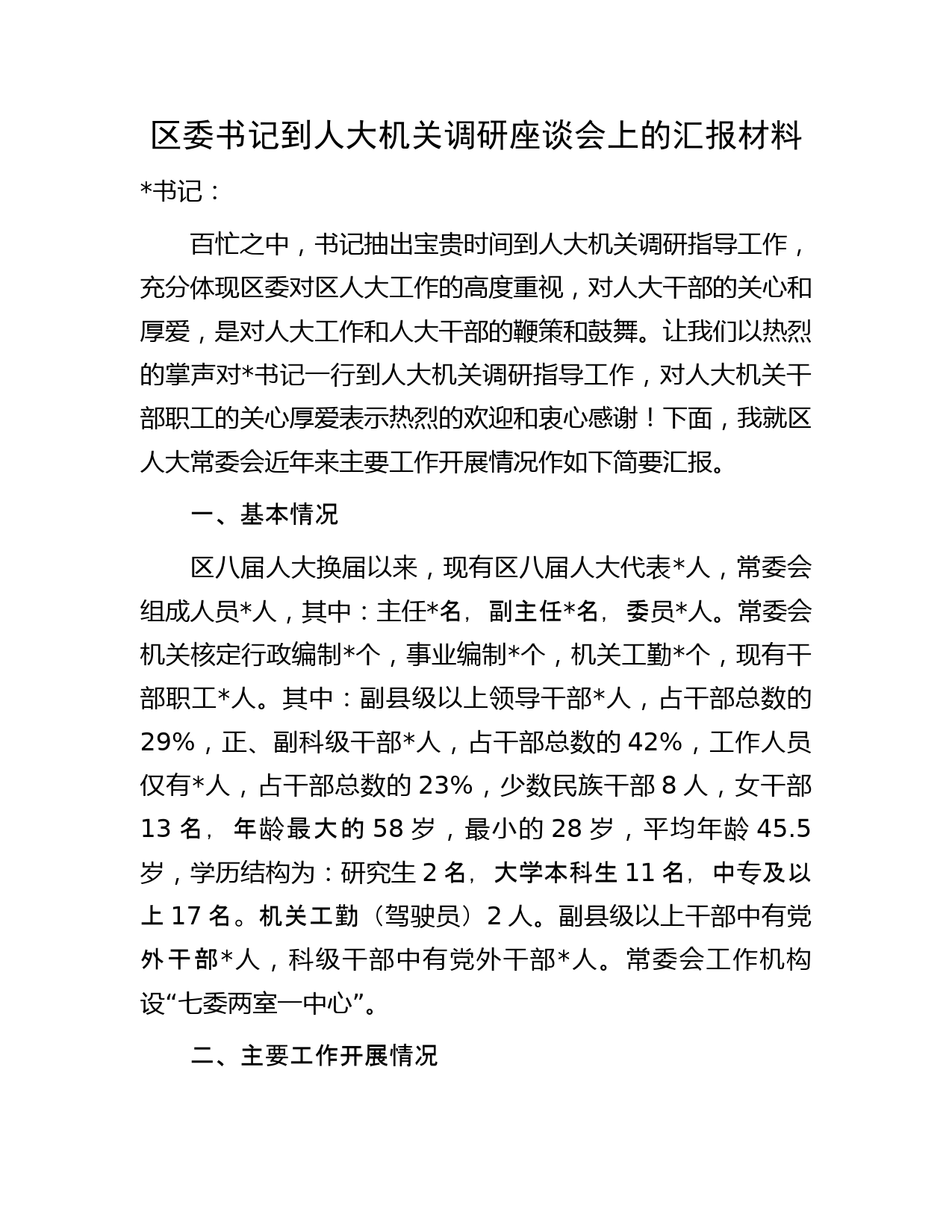 區(qū)委書記到人大機關調(diào)研座談會上的匯報材料書記:百忙之中,書記抽出寶貴時間到人大機關調(diào)研指導工作,充分體現(xiàn)區(qū)委對區(qū)人大工作的高度重視,對人大干部的關心和厚愛,是對人大工作和人大干部的鞭策和鼓舞。讓我們以熱烈的掌聲對書記一行到人大機關調(diào)研指導工作,對人大機關干部職工的關心厚愛表示熱烈的歡迎和衷心感謝!下面,我就區(qū)人大常委會近年來主要工作開展情況作如下簡要匯報。一、基本情況區(qū)八屆人大換屆以來,現(xiàn)有區(qū)八屆人大代表人,常委會組成人員人,其中:主任名,副主任名,委員人。常委會機關核定行政編制個,事業(yè)編制個,機關工勤個,現(xiàn)有干部職工人。其...