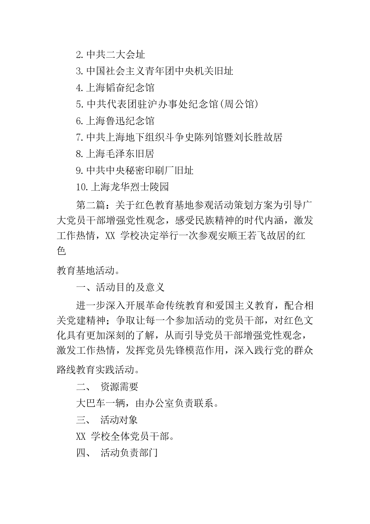 關于紅色教育基地參觀活動策劃方案五篇第一篇:關于紅色教育基地參觀活動策劃方案一、活動目的在中國GC黨誕生地的上海,有著諸多革命舊址。如中國GC黨第一次、第二次全國代表大會會址,龍華革命烈士紀念地,中國社會主義青年團中央機關舊址等等。這些地方,無不寫下現(xiàn)代史上中華民族可歌可泣的奮斗篇章,記錄著中國GC黨創(chuàng)建、發(fā)展與壯大的光輝足跡。一處處革命舊址都是黨的重要活動場所,有著豐富的歷史內涵。把這些舊址按時間順序排列下來,則有著密切的內在聯(lián)系,匯成一部豐富生動的中國GC黨歷史的教科書。這些革命舊址不僅是研究中國GC黨領導人民群眾進行革命斗爭的重...