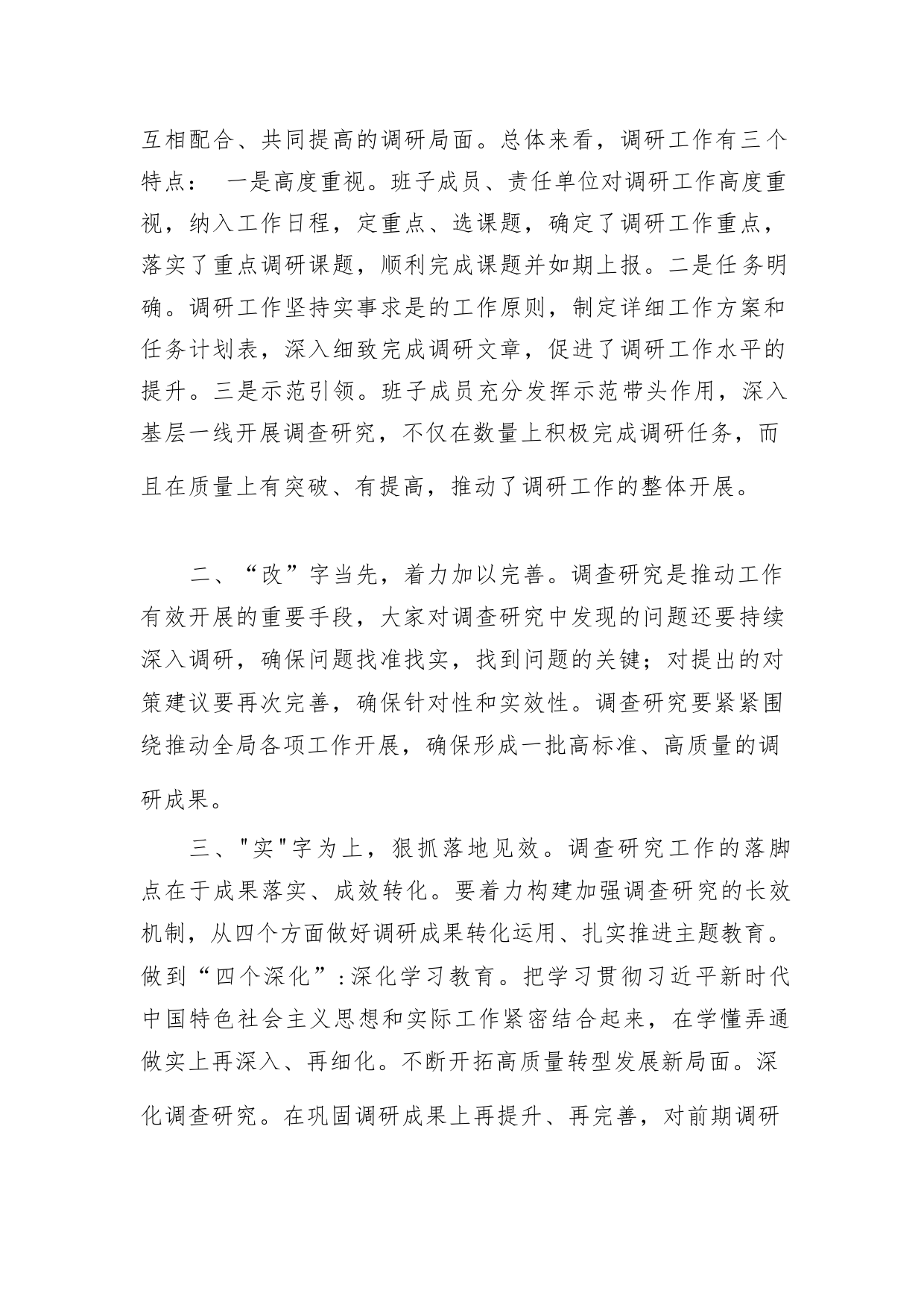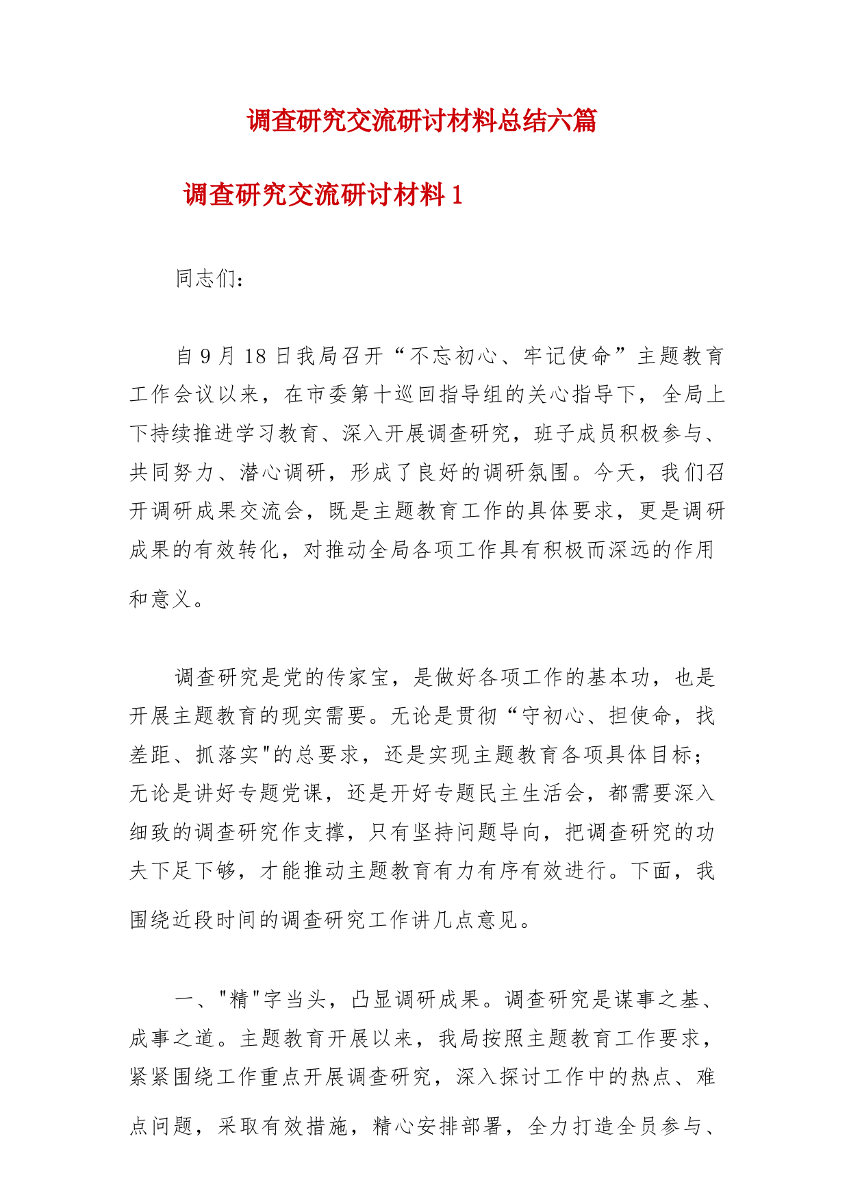 調查研究交流研討材料總結六篇調查研究交流研討材料1同志們:自9月18日我局召開“不忘初心、牢記使命”主題教育工作會議以來,在市委第十巡回指導組的關心指導下,全局上下持續(xù)推進學習教育、深入開展調查研究,班子成員積極參與、共同努力、潛心調研,形成了良好的調研氛圍。今天,我們召開調研成果交流會,既是主題教育工作的具體要求,更是調研成果的有效轉化,對推動全局各項工作具有積極而深遠的作用和意義。調查研究是黨的傳家寶,是做好各項工作的基本功,也是開展主題教育的現(xiàn)實需要。無論是貫徹“守初心、擔使命,找差距、抓落實"的總要求,還是實現(xiàn)主題教育各...