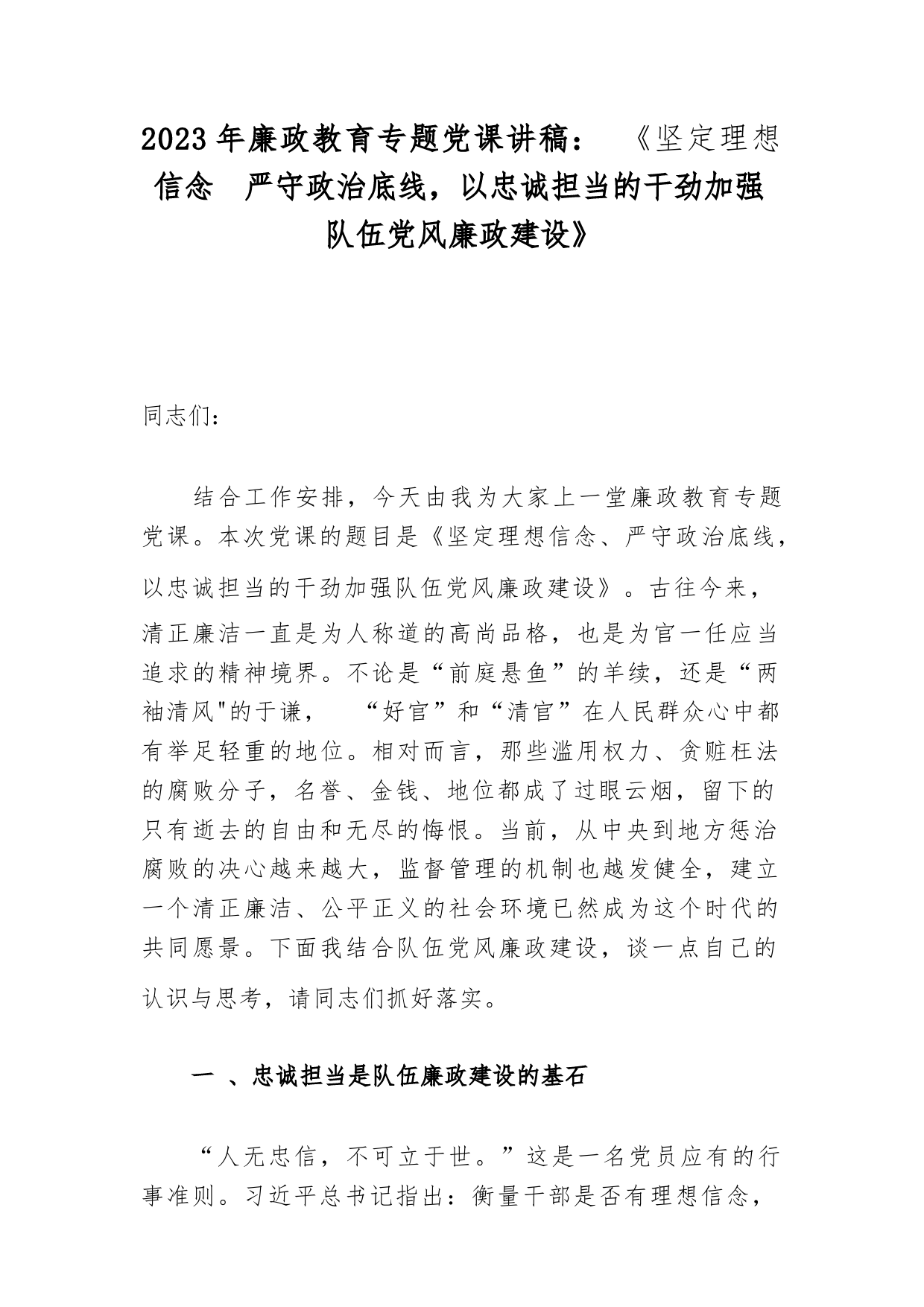 2023年廉政教育專題黨課講稿:《堅(jiān)定理想信念嚴(yán)守政治底線,以忠誠擔(dān)當(dāng)?shù)母蓜偶訌?qiáng)隊(duì)伍黨風(fēng)廉政建設(shè)》同志們:結(jié)合工作安排,今天由我為大家上一堂廉政教育專題黨課。本次黨課的題目是《堅(jiān)定理想信念、嚴(yán)守政治底線,以忠誠擔(dān)當(dāng)?shù)母蓜偶訌?qiáng)隊(duì)伍黨風(fēng)廉政建設(shè)》。古往今來,清正廉潔一直是為人稱道的高尚品格,也是為官一任應(yīng)當(dāng)追求的精神境界。不論是“前庭懸魚”的羊續(xù),還是“兩袖清風(fēng)"的于謙,“好官”和“清官”在人民群眾心中都有舉足輕重的地位。相對而言,那些濫用權(quán)力、貪贓枉法的腐敗分子,名譽(yù)、金錢、地位都成了過眼云煙,留下的只有逝去的自由和無盡的悔恨。當(dāng)...