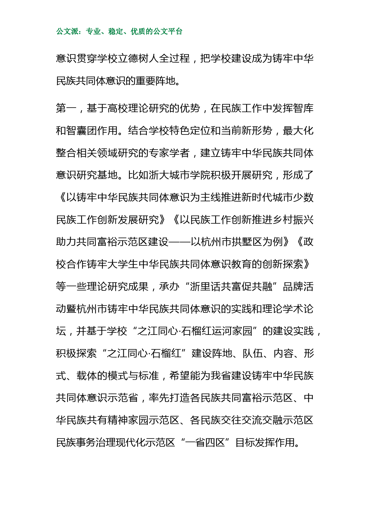 公文派:專業(yè)、穩(wěn)定、優(yōu)質(zhì)的公文平臺(tái)中華民族共同體意識(shí)教育的五個(gè)著力點(diǎn)近期,中央統(tǒng)戰(zhàn)部、中央宣傳部、教育部、國(guó)家民委共同印發(fā)《關(guān)于加強(qiáng)鑄牢中華民族共同體意識(shí)理論研究體系建設(shè)的意見(jiàn)》,提出加快建立和不斷完善鑄牢中華民族共同體意識(shí)理論研究體系,努力推動(dòng)中華民族共同體研究不斷走向深入。黨的十八大以來(lái),以XJP同志為核心的黨中央高度重視民族工作,2017年黨的十九大報(bào)告中提出,鑄牢中華民族共同體意識(shí),加強(qiáng)各民族交往交流交融,促進(jìn)各民族像石榴籽一樣緊緊抱在一起,共同團(tuán)結(jié)奮斗、共同繁榮發(fā)展。2021年在中央民族工作會(huì)議上,XJP總書記強(qiáng)調(diào),要構(gòu)建鑄牢中...