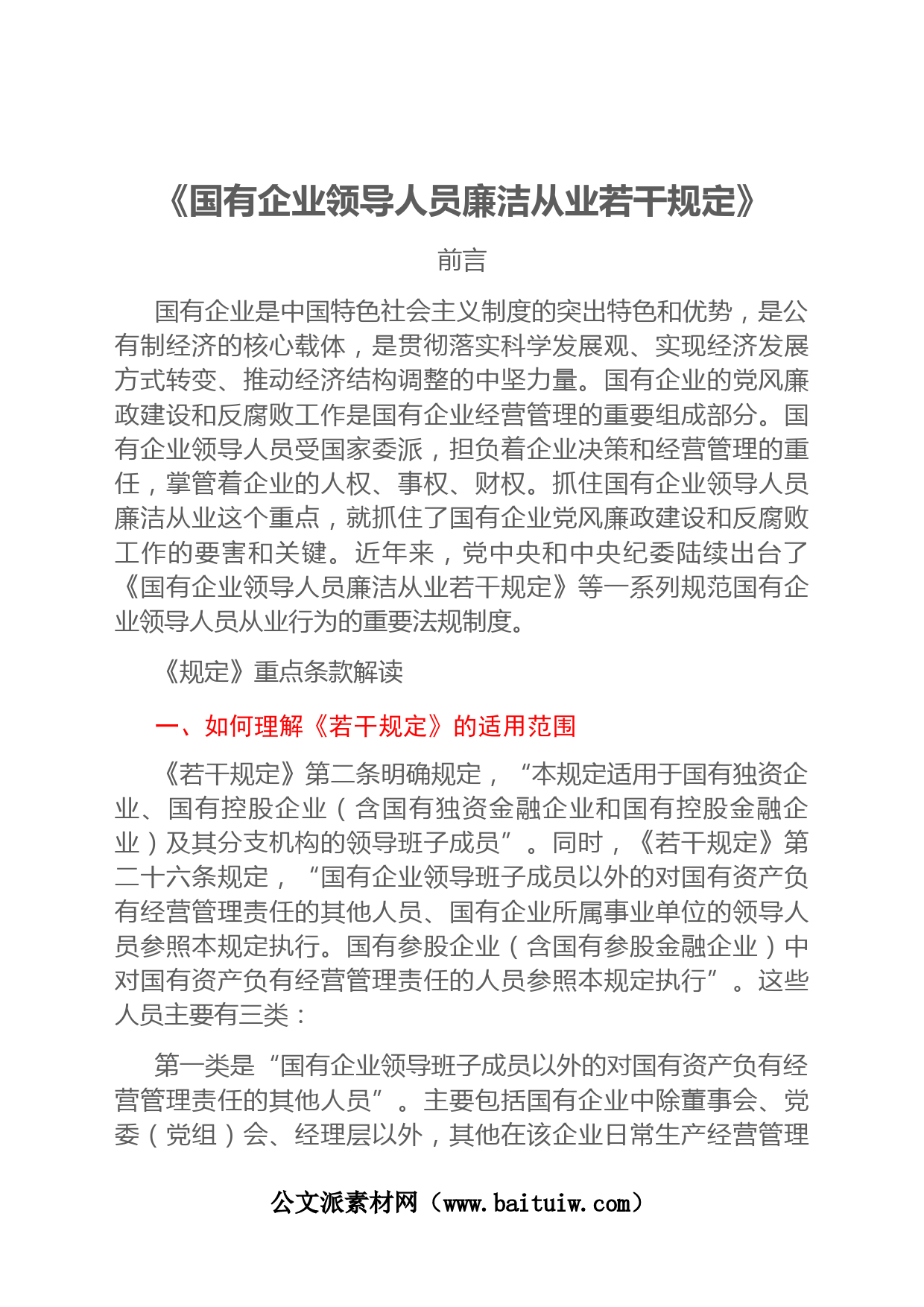 《國(guó)有企業(yè)領(lǐng)導(dǎo)人員廉潔從業(yè)若干規(guī)定》前言國(guó)有企業(yè)是中國(guó)特色社會(huì)主義制度的突出特色和優(yōu)勢(shì),是公有制經(jīng)濟(jì)的核心載體,是貫徹落實(shí)科學(xué)發(fā)展觀、實(shí)現(xiàn)經(jīng)濟(jì)發(fā)展方式轉(zhuǎn)變、推動(dòng)經(jīng)濟(jì)結(jié)構(gòu)調(diào)整的中堅(jiān)力量。國(guó)有企業(yè)的黨風(fēng)廉政建設(shè)和反腐敗工作是國(guó)有企業(yè)經(jīng)營(yíng)管理的重要組成部分。國(guó)有企業(yè)領(lǐng)導(dǎo)人員受國(guó)家委派,擔(dān)負(fù)著企業(yè)決策和經(jīng)營(yíng)管理的重任,掌管著企業(yè)的人權(quán)、事權(quán)、財(cái)權(quán)。抓住國(guó)有企業(yè)領(lǐng)導(dǎo)人員廉潔從業(yè)這個(gè)重點(diǎn),就抓住了國(guó)有企業(yè)黨風(fēng)廉政建設(shè)和反腐敗工作的要害和關(guān)鍵。近年來(lái),黨中央和中央紀(jì)委陸續(xù)出臺(tái)了《國(guó)有企業(yè)領(lǐng)導(dǎo)人員廉潔從業(yè)若干規(guī)定》等一系列規(guī)范國(guó)有企業(yè)領(lǐng)導(dǎo)人...
