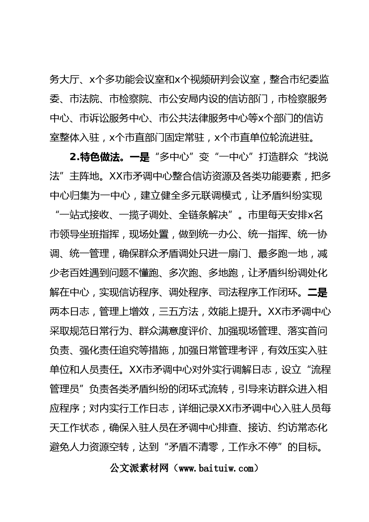 關(guān)于赴xx地學(xué)習(xí)矛盾糾紛調(diào)處工作先進(jìn)經(jīng)驗(yàn)的考察報(bào)告為全面做好市域社會(huì)治理現(xiàn)代化試點(diǎn)自治區(qū)驗(yàn)收整改工作,進(jìn)一步提升創(chuàng)新推動(dòng)全市矛盾糾紛多元化解能力,提質(zhì)增效迎接中央抽查復(fù)核工作,2023年x月x日至x月x日,市委政法委副書記xx帶領(lǐng)市司法局、市信訪局等部門分管領(lǐng)導(dǎo)和相關(guān)縣(區(qū))分管副書記等一行x人,赴xx市XX市、XX市開(kāi)展矛盾糾紛調(diào)處工作專題考察??疾旖M通過(guò)座談交流、實(shí)地觀摩等方式,學(xué)習(xí)交流“一站式”矛盾糾紛調(diào)處工作的先進(jìn)經(jīng)驗(yàn),現(xiàn)將有關(guān)情況報(bào)告如下:一、開(kāi)展矛盾糾紛調(diào)處工作的經(jīng)驗(yàn)做法(一)XX市開(kāi)展矛盾糾紛調(diào)處工作的經(jīng)驗(yàn)做法1.XX市矛盾糾紛調(diào)處化...