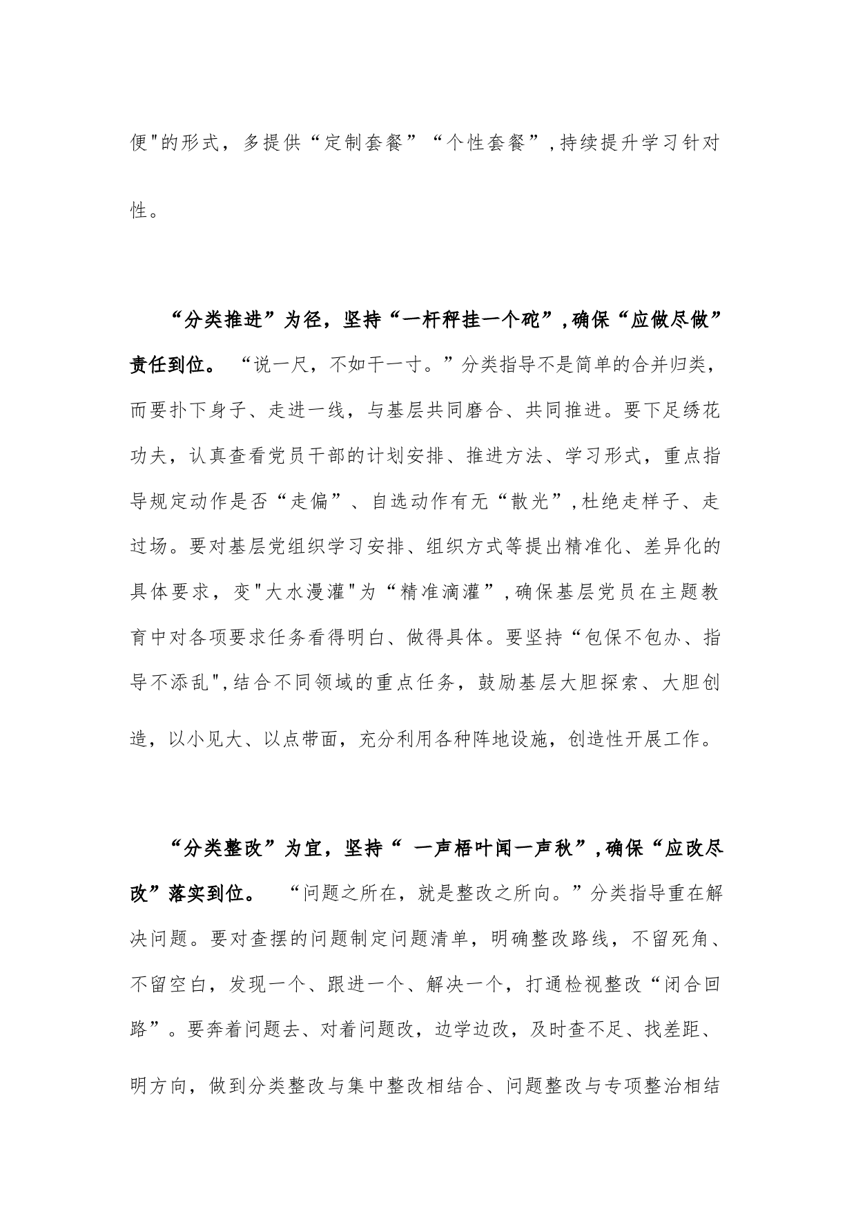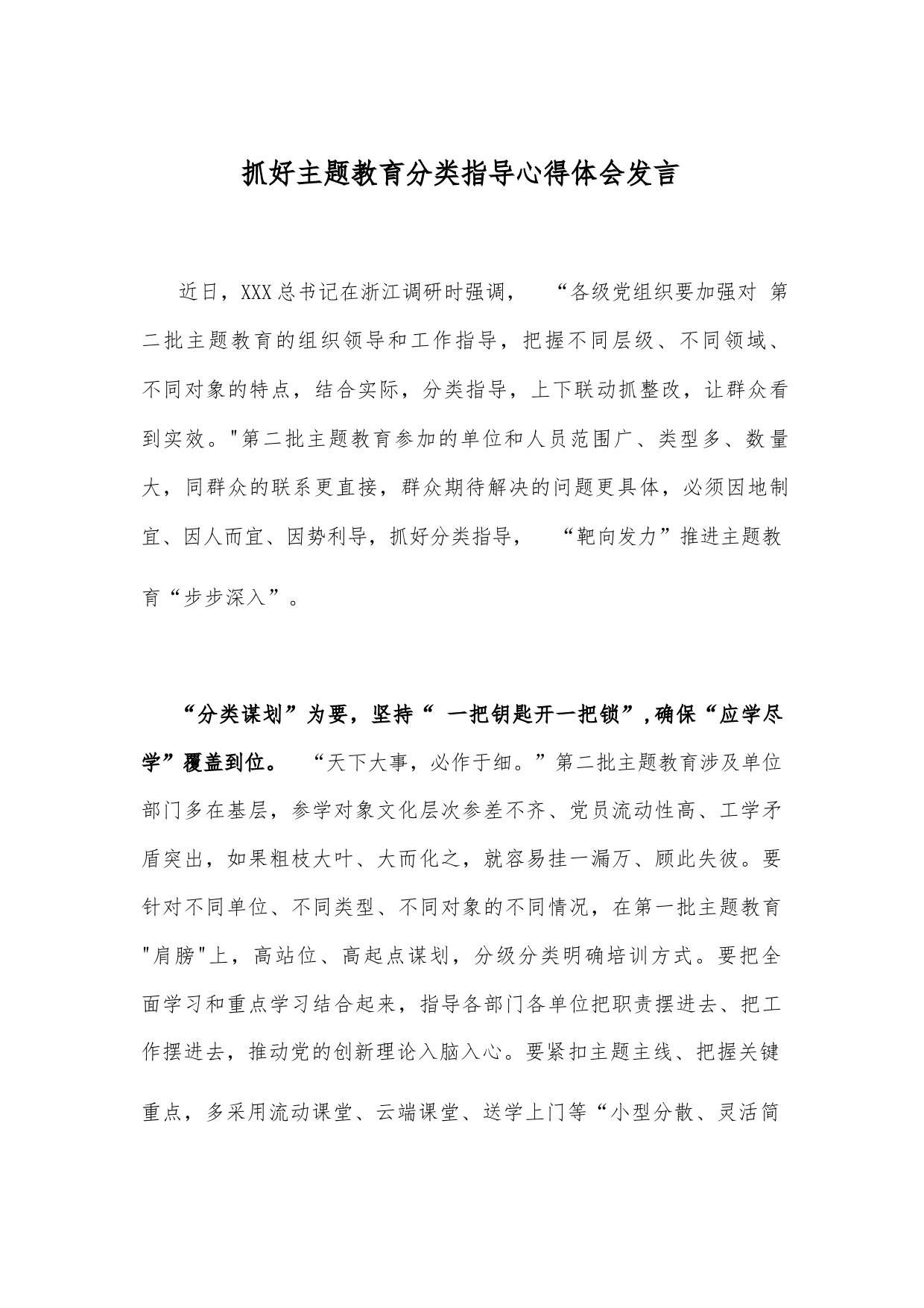 抓好主題教育分類指導(dǎo)心得體會發(fā)言近日,XXX總書記在浙江調(diào)研時強調(diào),“各級黨組織要加強對第二批主題教育的組織領(lǐng)導(dǎo)和工作指導(dǎo),把握不同層級、不同領(lǐng)域、不同對象的特點,結(jié)合實際,分類指導(dǎo),上下聯(lián)動抓整改,讓群眾看到實效。"第二批主題教育參加的單位和人員范圍廣、類型多、數(shù)量大,同群眾的聯(lián)系更直接,群眾期待解決的問題更具體,必須因地制宜、因人而宜、因勢利導(dǎo),抓好分類指導(dǎo),“靶向發(fā)力”推進主題教育“步步深入”。“分類謀劃”為要,堅持“一把鑰匙開一把鎖”,確?!皯?yīng)學(xué)盡學(xué)”覆蓋到位?!疤煜麓笫拢刈饔诩??!钡诙黝}教育涉及單位部門多在基層,...