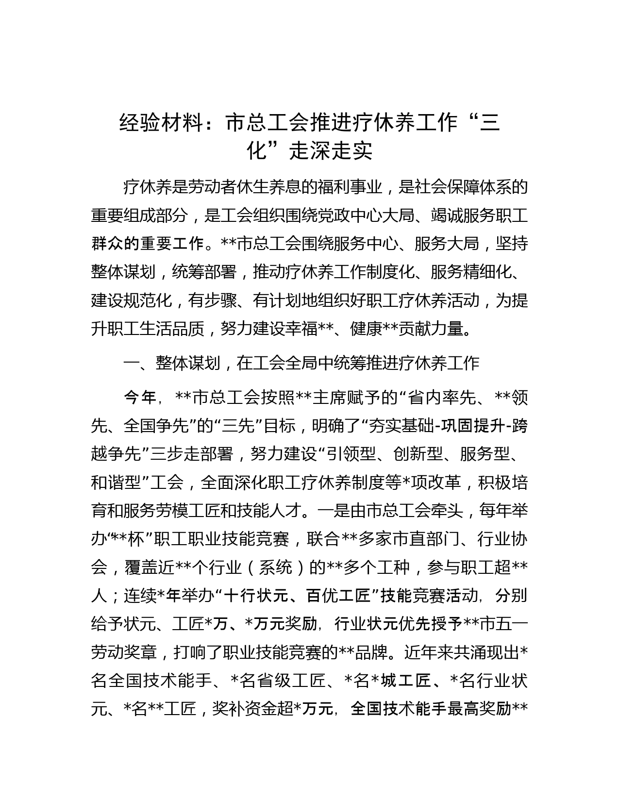經(jīng)驗材料:市總工會推進療休養(yǎng)工作“三化”走深走實療休養(yǎng)是勞動者休生養(yǎng)息的福利事業(yè),是社會保障體系的重要組成部分,是工會組織圍繞黨政中心大局、竭誠服務(wù)職工群眾的重要工作。市總工會圍繞服務(wù)中心、服務(wù)大局,堅持整體謀劃,統(tǒng)籌部署,推動療休養(yǎng)工作制度化、服務(wù)精細(xì)化、建設(shè)規(guī)范化,有步驟、有計劃地組織好職工療休養(yǎng)活動,為提升職工生活品質(zhì),努力建設(shè)幸福、健康貢獻力量。一、整體謀劃,在工會全局中統(tǒng)籌推進療休養(yǎng)工作今年,市總工會按照主席賦予的“省內(nèi)率先、領(lǐng)先、全國爭先”的“三先”目標(biāo),明確了“夯實基礎(chǔ)-鞏固提升-跨越爭先”三步走部署,努力建設(shè)“...