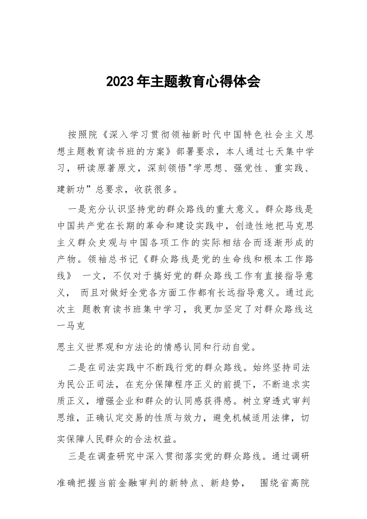 2023年主題教育心得體會(huì)按照院《深入學(xué)習(xí)貫徹領(lǐng)袖新時(shí)代中國(guó)特色社會(huì)主義思想主題教育讀書(shū)班的方案》部署要求,本人通過(guò)七天集中學(xué)習(xí),研讀原著原文,深刻領(lǐng)悟"學(xué)思想、強(qiáng)黨性、重實(shí)踐、建新功”總要求,收獲很多。一是充分認(rèn)識(shí)堅(jiān)持黨的群眾路線的重大意義。群眾路線是中國(guó)共產(chǎn)黨在長(zhǎng)期的革命和建設(shè)實(shí)踐中,創(chuàng)造性地把馬克思主義群眾史觀與中國(guó)各項(xiàng)工作的實(shí)際相結(jié)合而逐漸形成的產(chǎn)物。領(lǐng)袖總書(shū)記《群眾路線是黨的生命線和根本工作路線》一文,不僅對(duì)于搞好黨的群眾路線工作有直接指導(dǎo)意義,而且對(duì)做好全黨各方面工作都有長(zhǎng)遠(yuǎn)指導(dǎo)意義。通過(guò)此次主題教育讀書(shū)班集中學(xué)習(xí),...