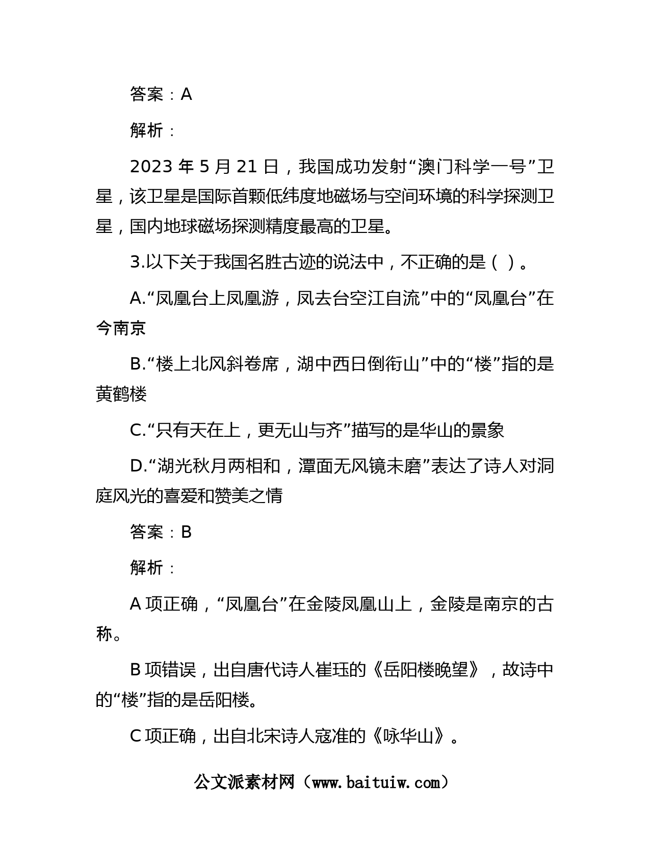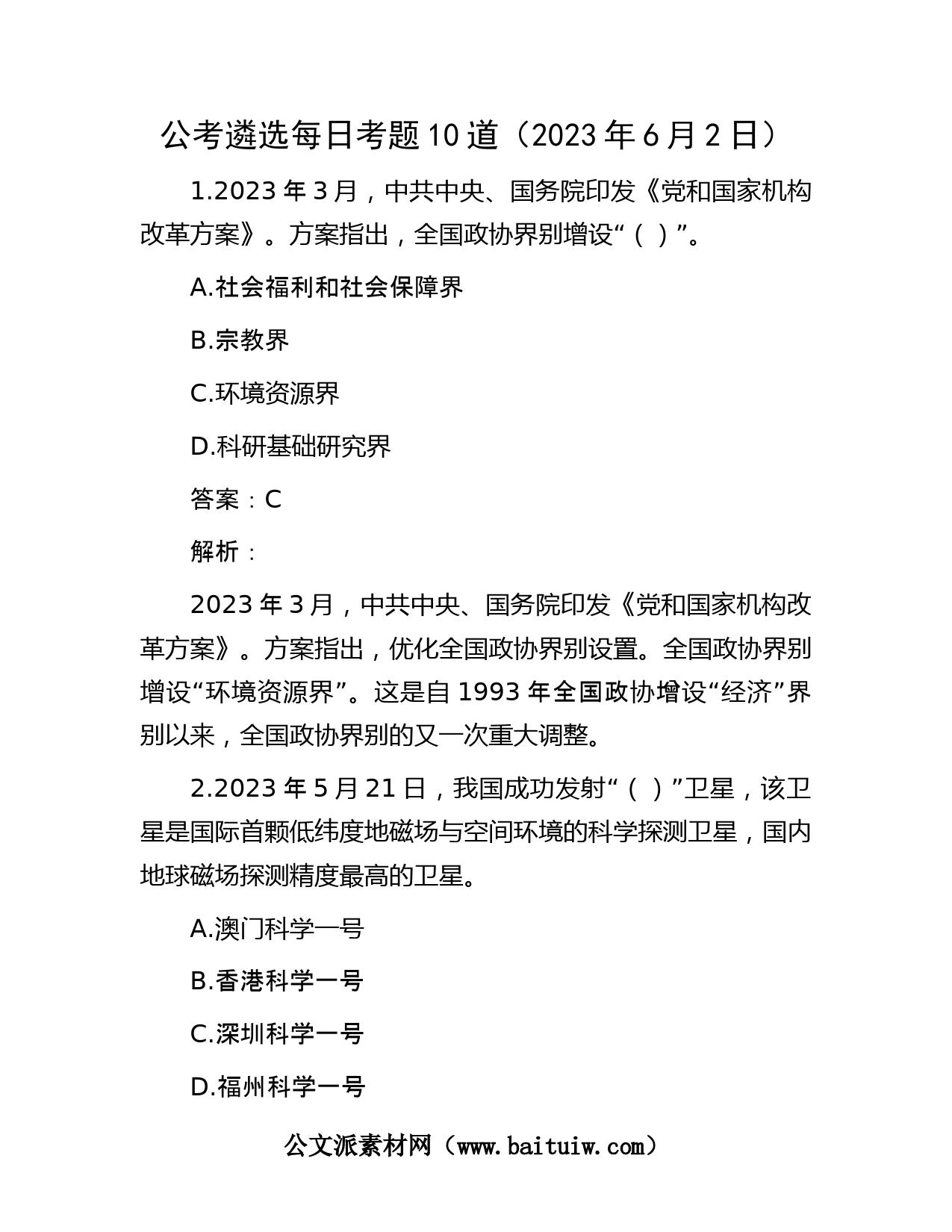 公考遴選每日考題10道(2023年6月2日)1.2023年3月,中共中央、國(guó)務(wù)院印發(fā)《黨和國(guó)家機(jī)構(gòu)改革方案》。方案指出,全國(guó)政協(xié)界別增設(shè)“()”。A.社會(huì)福利和社會(huì)保障界B.宗教界C.環(huán)境資源界D.科研基礎(chǔ)研究界答案:C解析:2023年3月,中共中央、國(guó)務(wù)院印發(fā)《黨和國(guó)家機(jī)構(gòu)改革方案》。方案指出,優(yōu)化全國(guó)政協(xié)界別設(shè)置。全國(guó)政協(xié)界別增設(shè)“環(huán)境資源界”。這是自1993年全國(guó)政協(xié)增設(shè)“經(jīng)濟(jì)”界別以來(lái),全國(guó)政協(xié)界別的又一次重大調(diào)整。2.2023年5月21日,我國(guó)成功發(fā)射“()”衛(wèi)星,該衛(wèi)星是國(guó)際首顆低緯度地磁場(chǎng)與空間環(huán)境的科學(xué)探測(cè)衛(wèi)星,國(guó)內(nèi)地球磁場(chǎng)探測(cè)精度最高的衛(wèi)星。A.澳門...