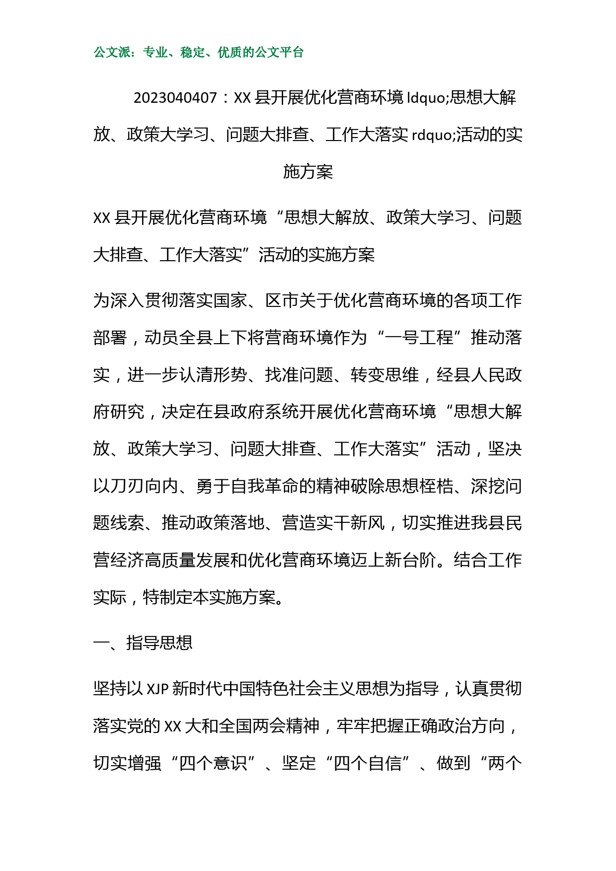 XX縣開展優(yōu)化營商環(huán)境思想大解放、政策大學(xué)習(xí)、問題大排查、工作大落實(shí)活動(dòng)的實(shí)施方案VIP免費(fèi)