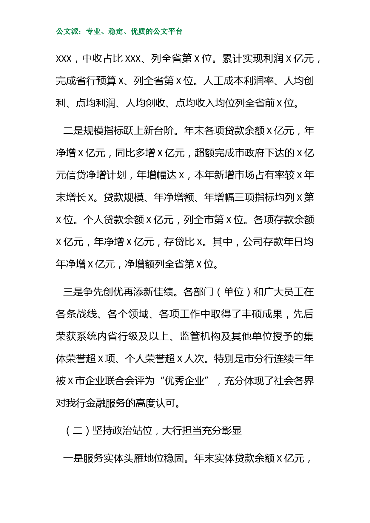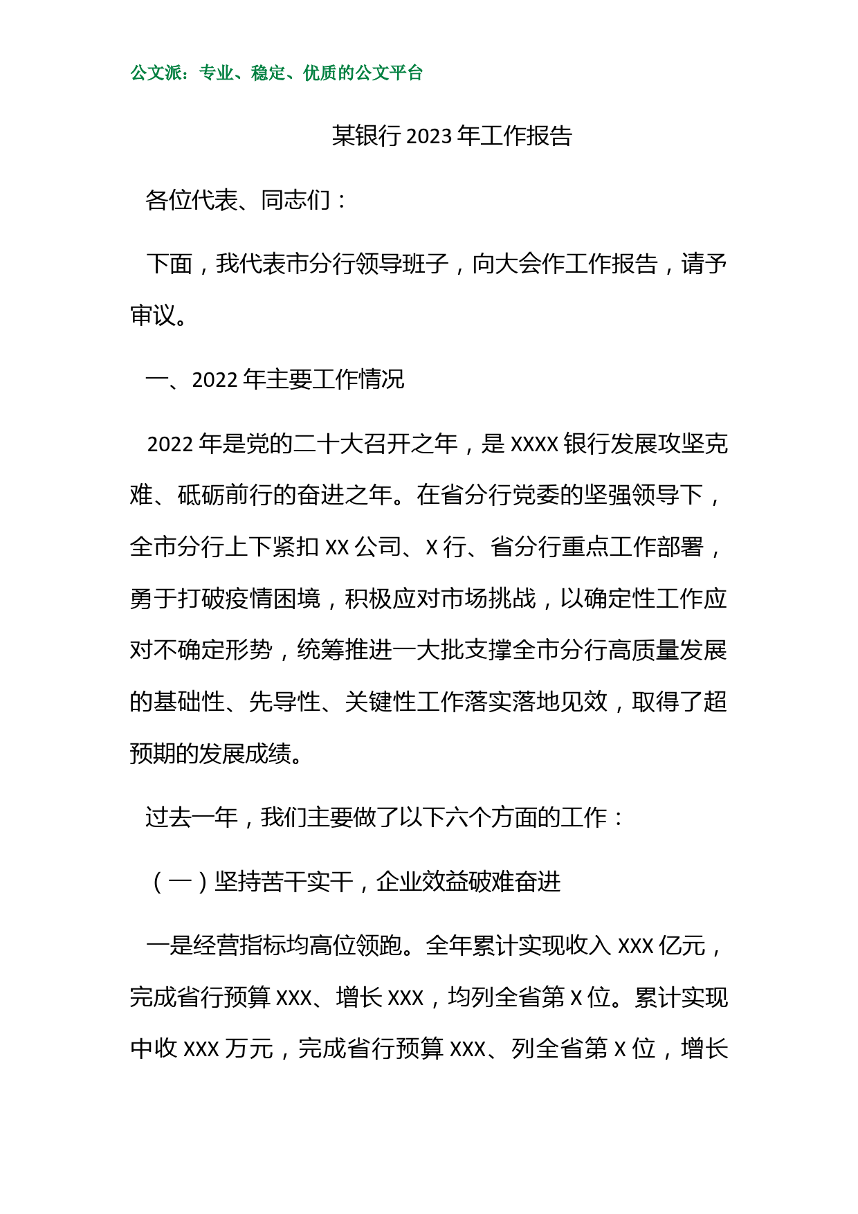 公文派:專業(yè)、穩(wěn)定、優(yōu)質(zhì)的公文平臺(tái)某銀行2023年工作報(bào)告各位代表、同志們:下面,我代表市分行領(lǐng)導(dǎo)班子,向大會(huì)作工作報(bào)告,請(qǐng)予審議。一、2022年主要工作情況2022年是黨的二十大召開(kāi)之年,是XXXX銀行發(fā)展攻堅(jiān)克難、砥礪前行的奮進(jìn)之年。在省分行黨委的堅(jiān)強(qiáng)領(lǐng)導(dǎo)下,全市分行上下緊扣XX公司、X行、省分行重點(diǎn)工作部署,勇于打破疫情困境,積極應(yīng)對(duì)市場(chǎng)挑戰(zhàn),以確定性工作應(yīng)對(duì)不確定形勢(shì),統(tǒng)籌推進(jìn)一大批支撐全市分行高質(zhì)量發(fā)展的基礎(chǔ)性、先導(dǎo)性、關(guān)鍵性工作落實(shí)落地見(jiàn)效,取得了超預(yù)期的發(fā)展成績(jī)。過(guò)去一年,我們主要做了以下六個(gè)方面的工作:(一)堅(jiān)持苦干實(shí)干,企業(yè)...