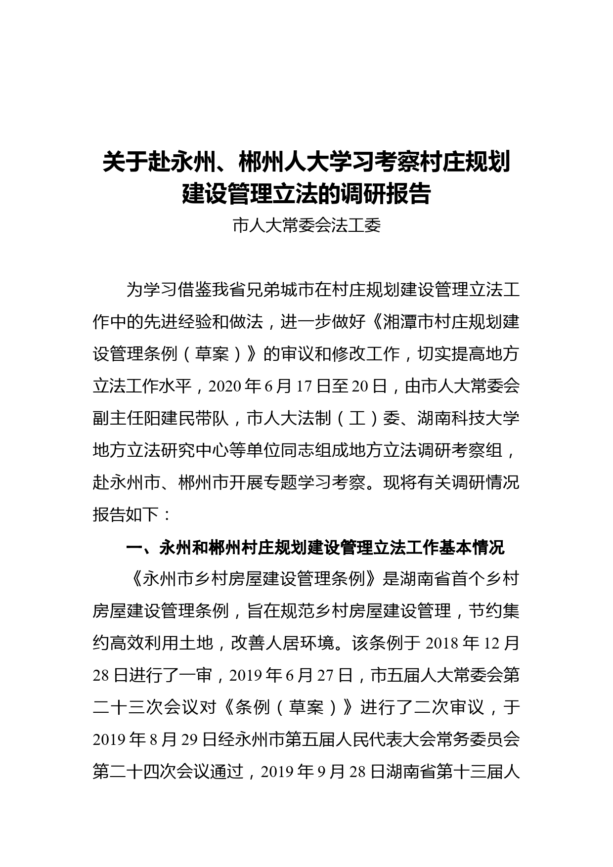 關于赴永州、郴州人大學習考察村莊規(guī)劃建設管理立法的調研報告(2020.08.28)VIP免費