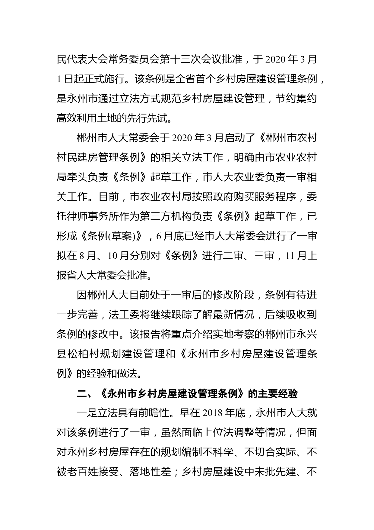 關于赴永州、郴州人大學習考察村莊規(guī)劃建設管理立法的調研報告市人大常委會法工委??為學習借鑒我省兄弟城市在村莊規(guī)劃建設管理立法工作中的先進經驗和做法,進一步做好《湘潭市村莊規(guī)劃建設管理條例(草案)》的審議和修改工作,切實提高地方立法工作水平,2020年6月17日至20日,由市人大常委會副主任陽建民帶隊,市人大法制(工)委、湖南科技大學地方立法研究中心等單位同志組成地方立法調研考察組,赴永州市、郴州市開展專題學習考察?,F(xiàn)將有關調研情況報告如下:一、永州和郴州村莊規(guī)劃建設管理立法工作基本情況《永州市鄉(xiāng)村房屋建設管理條例》是湖南省首個鄉(xiāng)村房...
